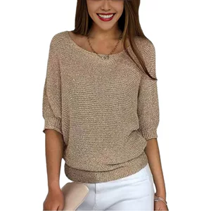 Популярный женский трикотаж AliExpress на Amazon 2024, однотонный воротник, рубашка «летучая мышь», трикотаж пуловера, свободный топ с нитками