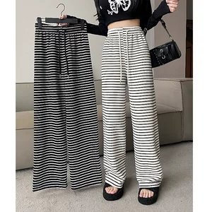 Черно-белые повседневные брюки в полоску, женские прямые брюки с широкими штанинами из ледяного шелка, длинные брюки с высокой талией и драпировкой
