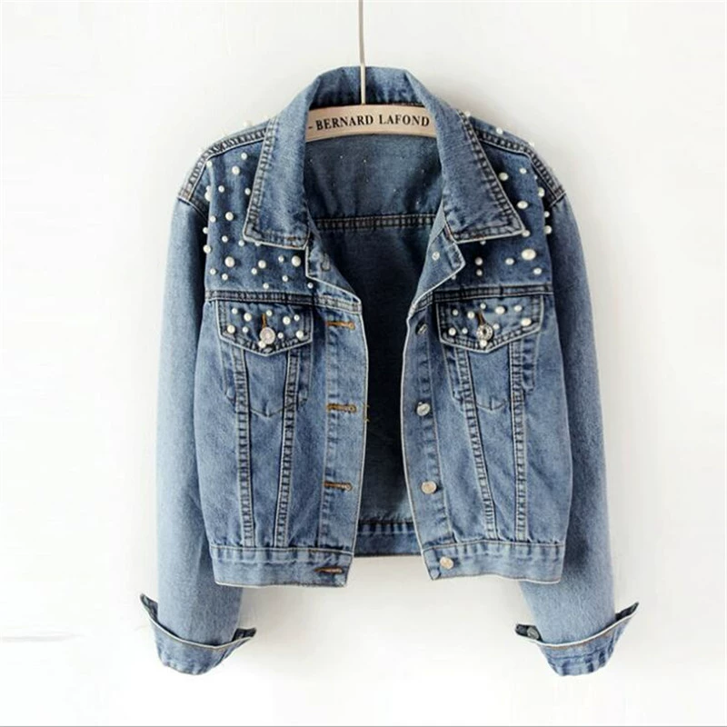 AliExpress Amazon Explosions желает, новое джинсовое пальто с бусинами, Универсальный женский свободный облегающий топ с жемчугом