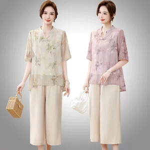 Мама одеваются 2024 Летний тонкий искусственный хлопок с короткими рукавами костюм среднего и пожилого женского возраста с короткими рукавами хлопковый шелковый набор из двух частей