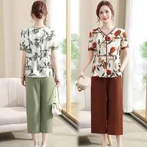 Костюм для бабушки, летняя одежда, женская одежда с принтом, комплект из двух предметов из хлопка и льна с короткими рукавами для мамы