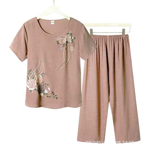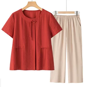 Топ для бабушки из хлопка и льна, домашняя летняя футболка с короткими рукавами, свободный костюм для мамы, комплект из двух предметов, Пижама для женщин среднего и пожилого возраста
