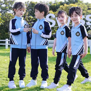 Школьная форма для начальной школы оптом из Шэньчжэня, для мальчиков и девочек, весенне-осенние хлопковые футболки с коротким рукавом, длинные брюки, быстросохнущая летняя одежда.