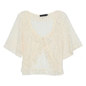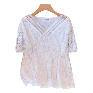 Новая летняя модель от Fat mm: шерстяная кружевная блузка с V-образным вырезом, свободного кроя, светло-белого цвета, с короткими рукавами, модель 262695.