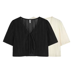 Шифоновая рубашка из смесовой шерсти с завязками на воротнике и слегка мятой текстурой, новый летний фасон для женщин больших размеров, свежий и свободный топ 222109.