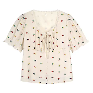Блузка-бэбидолл с цветочным принтом, шифоновая рубашка с коротким рукавом для женщин, весна-лето, нишевый стиль, свободный крой, утягивающий топ, элегантный и стильный, очень большой размер.