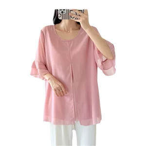 Блузка из шифона больших размеров с коротким рукавом для женщин, лето 2025, новая, свободная, с рюшами на рукавах, утягивающая, скрывающая живот, базовая рубашка