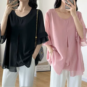 Блузка из шифона больших размеров с коротким рукавом для женщин, лето 2025, новая, свободная, с рюшами на рукавах, утягивающая, скрывающая живот, базовая рубашка