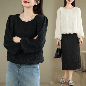 Рубашка с круглым вырезом из жаккарда шифоновая блузка 2025 осенний костюм новый свободный живот