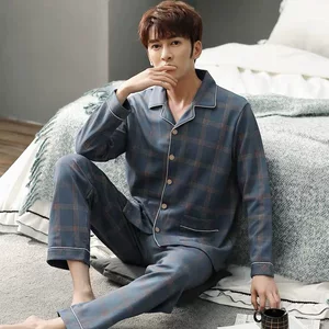 Мужская пижама с длинными рукавами, весна-осень, новейший высококачественный клетчатый костюм из искусственного хлопка, повседневная верхняя одежда больших размеров, домашняя одежда