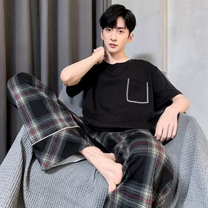 Пижамы мужские летние из чистого хлопка с короткими рукавами и брюками 2025 новые весенне-осенние мужские домашние костюмы, которые можно носить на улице с принтом