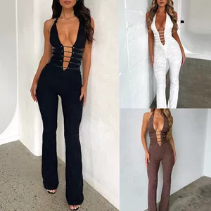 Летний новый женский модный комбинезон 2025 года в европейском и американском стиле, сексуальный, с завязками на груди, свободный воротник, облегающий талию и бедра, однотонный.