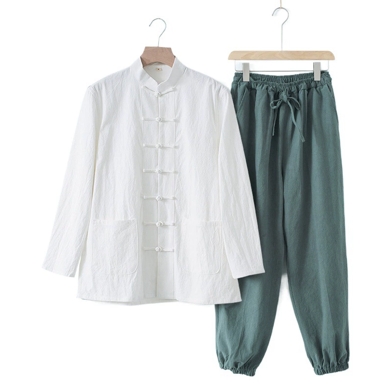 Костюм Тан в китайском стиле, мужской костюм с длинными рукавами из хлопка и льна, комплект из двух предметов, ретро одежда для мужа в китайском стиле с пряжкой, весна-осень, ханьфу
