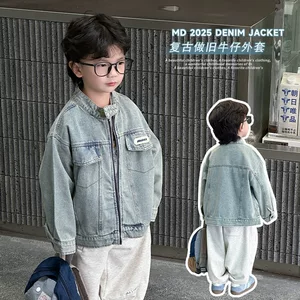 Детская джинсовая куртка 2026: новая модель весна-осень, ретро-стиль для мальчиков и девочек, винтажный вид, корейский стиль, джинсовая одежда для малышей, трендовая.