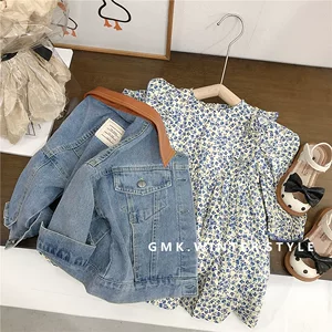 Модный костюм для девочек, весна 202, новый стиль, детская модная джинсовая куртка, платье, весенне-осенний комплект из двух предметов