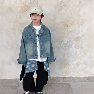 Детская джинсовая куртка 2025 года, осенний стиль Bangcheng, корейская клетчатая рубашка в стиле пэчворк для мальчиков, модная модель F0309