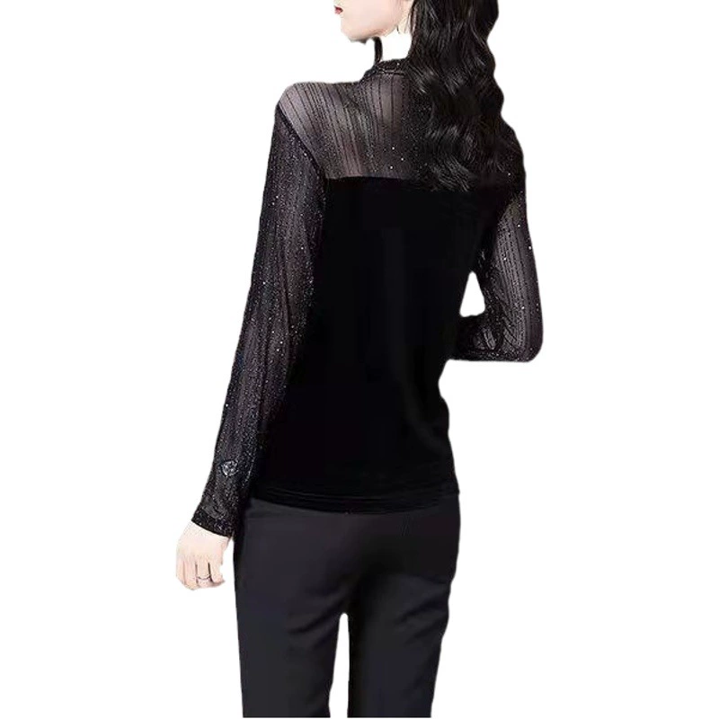 Универсальная женская базовая одежда для трансграничной торговли: сексуальная ультратонкая сетчатая высокоэластичная облегающая рубашка с длинным рукавом и полувысоким воротником.