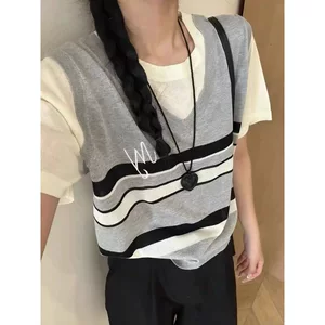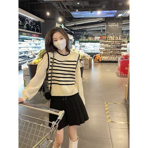 Поддельный свитер из двух частей для кормления Женская весна-лето 2025 Весенняя полоска Сшитая Короткая туза с круглым вырезом для тонкого кормления