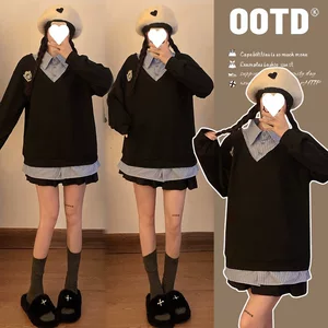 Реальный выстрел 2025 весна и осень новая полоска поддельные две трикотажные рубашки для беременных рубашки большого размера для беременных топ