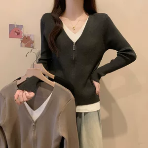 Осенне-зимний женский модный поддельный кардиган для беременных из двух частей, свитер с длинными рукавами, Свободный корейский вязаный свитер больших размеров с V-образным вырезом, открытый