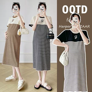Фактический снимок большой версии нового летнего платья для беременных с короткими рукавами в корейском стиле, модного свободного полосатого простого повседневного универсального топа…