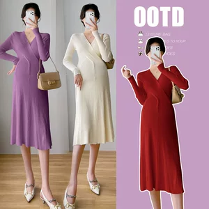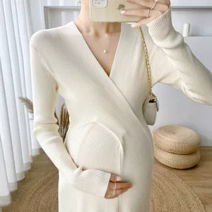 Платье для беременных осеннее новое модное корейское издание в полоску вязаный свитер с V-образным вырезом темпераментное тонкое платье-подтяжка