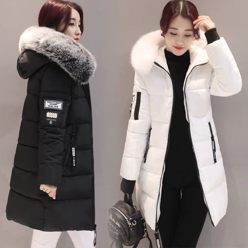 Трансграничное 2024, новое зимнее хлопковое пальто с большим меховым воротником для женщин, облегающая утолщенная хлопковая куртка для женщин, длинное хлопковое пальто выше колена в корейском стиле для женщин