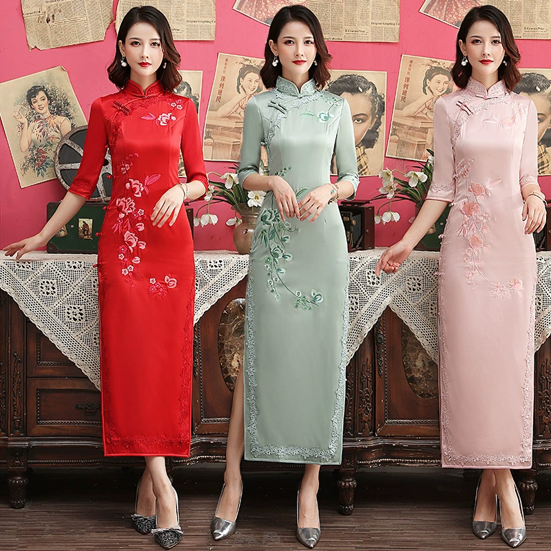 Новое летне-осеннее длинное платье-ципао 2025 года, женское, приталенное, для выступлений, в китайском стиле, из сатина, для мамы