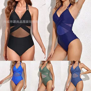 2024 Европейский и Американский трансграничный новый новый женский цельный бикини сплошной цвет крест сетчатая пряжа Amazon завод спот купальник