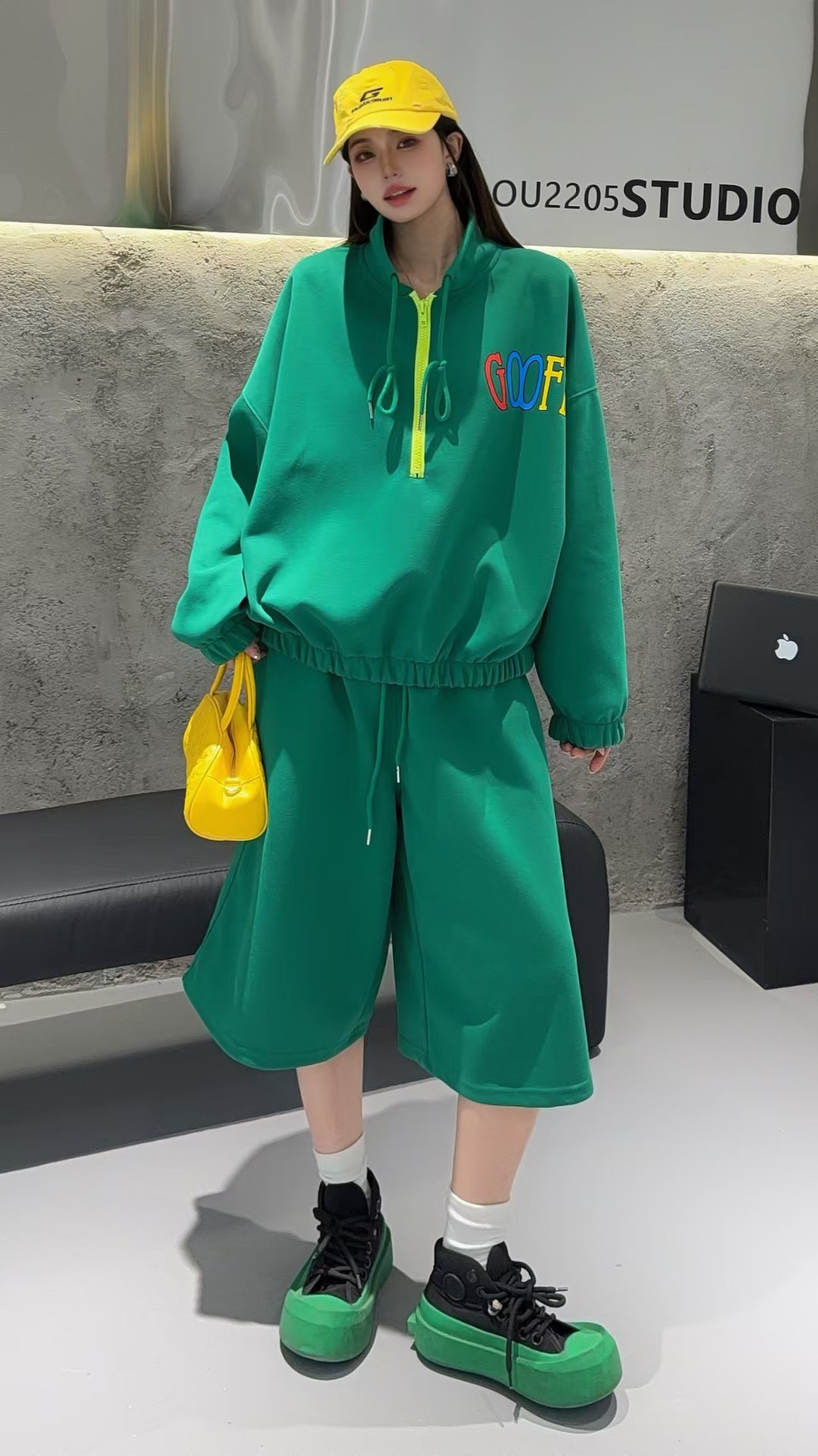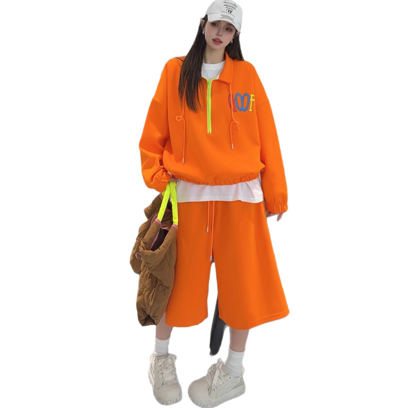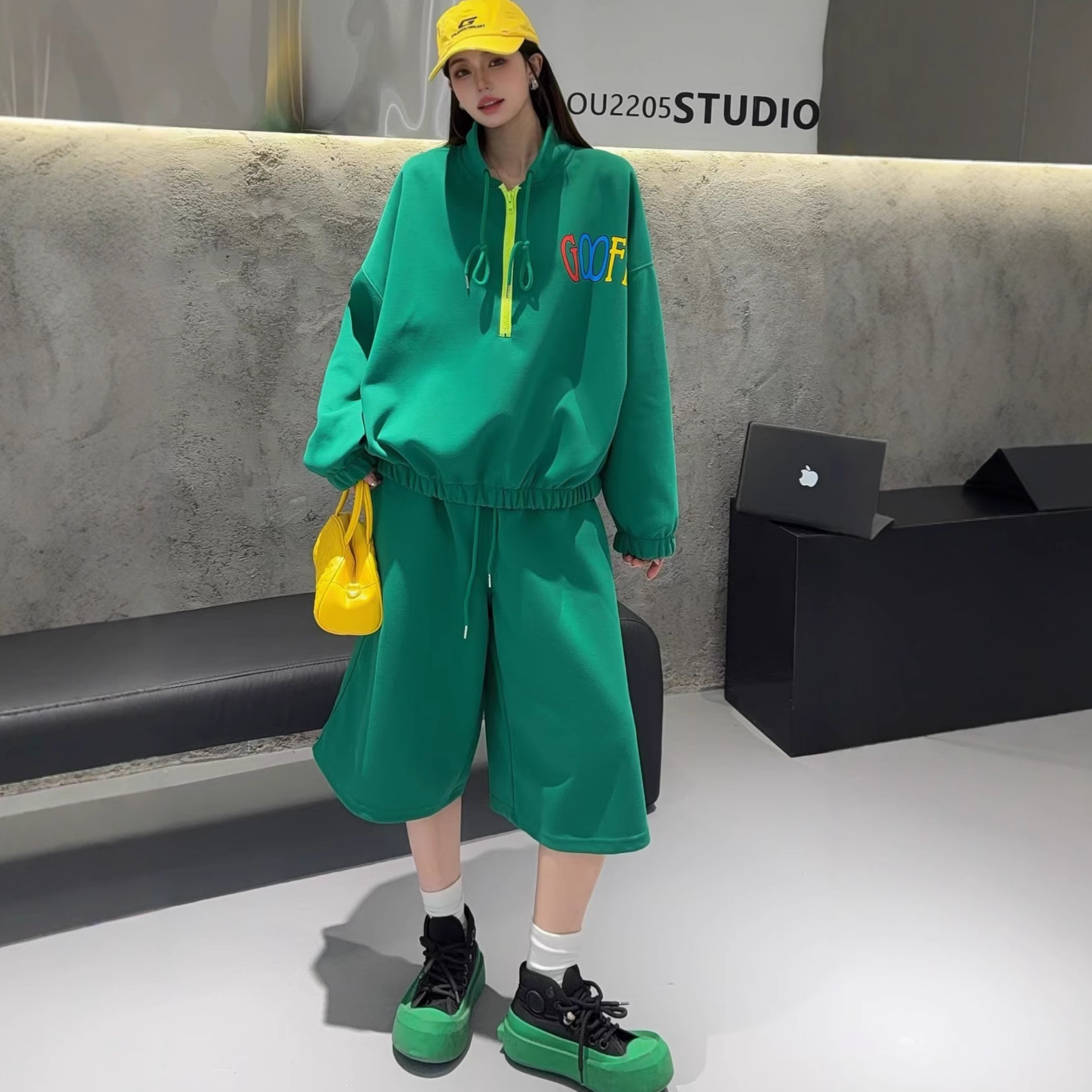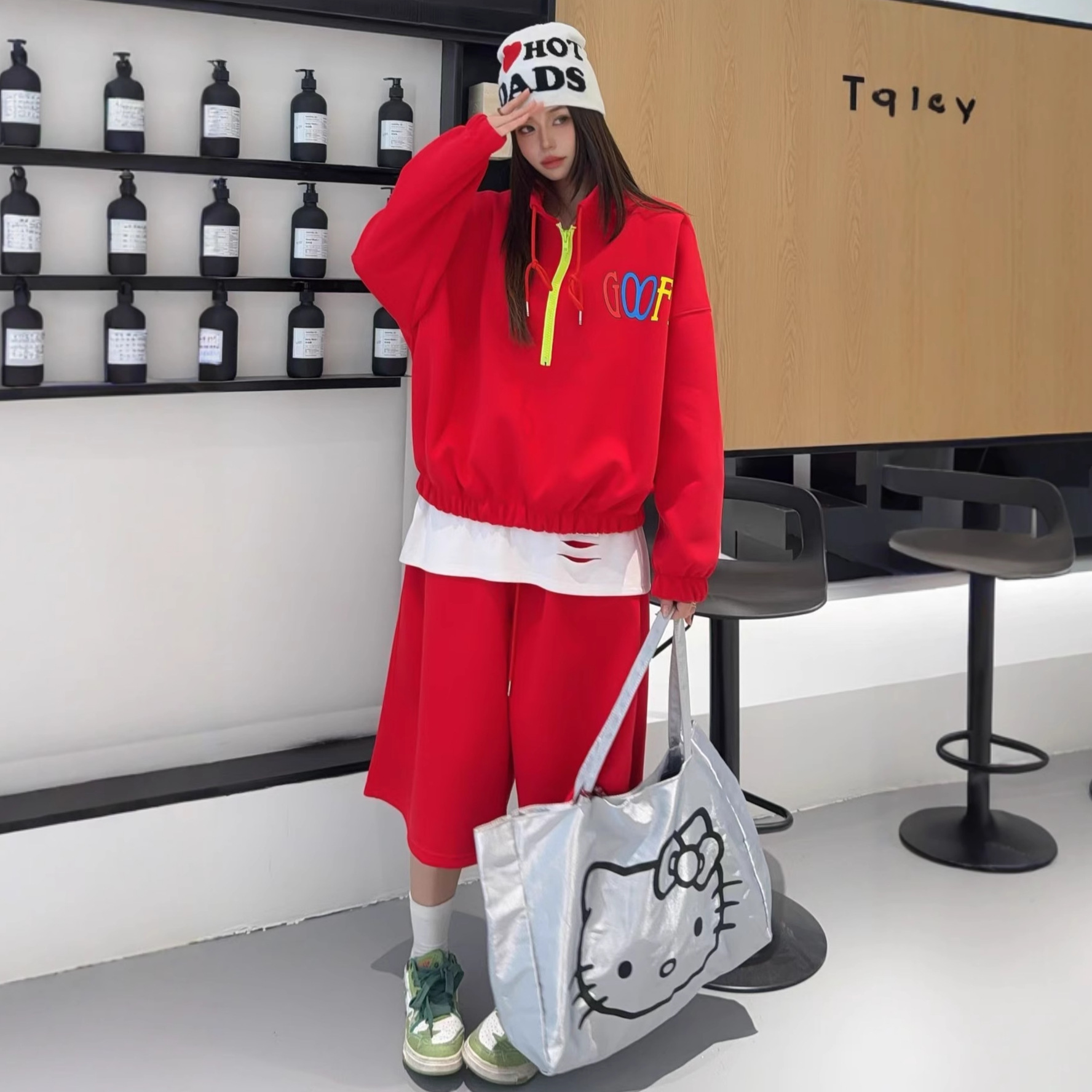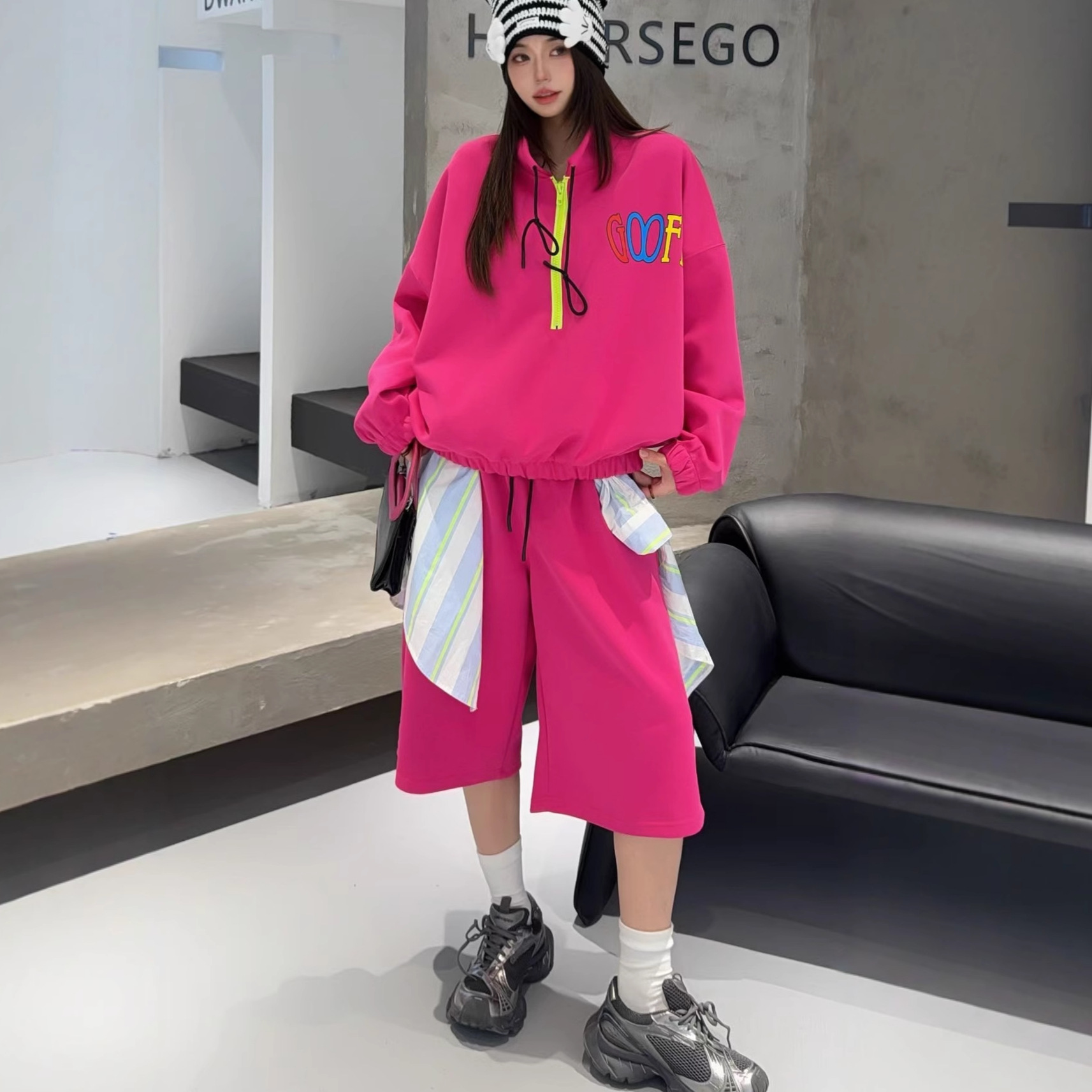 Весенний новый комплект: американский свитшот с завязками, укороченные брюки, женский модный дизайн, свободный крой, большой размер, двухсоставной комплект