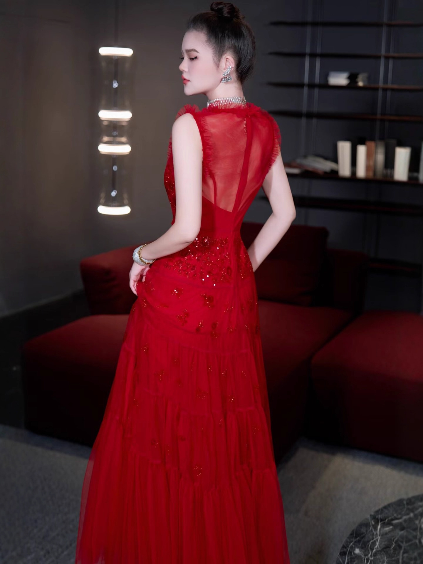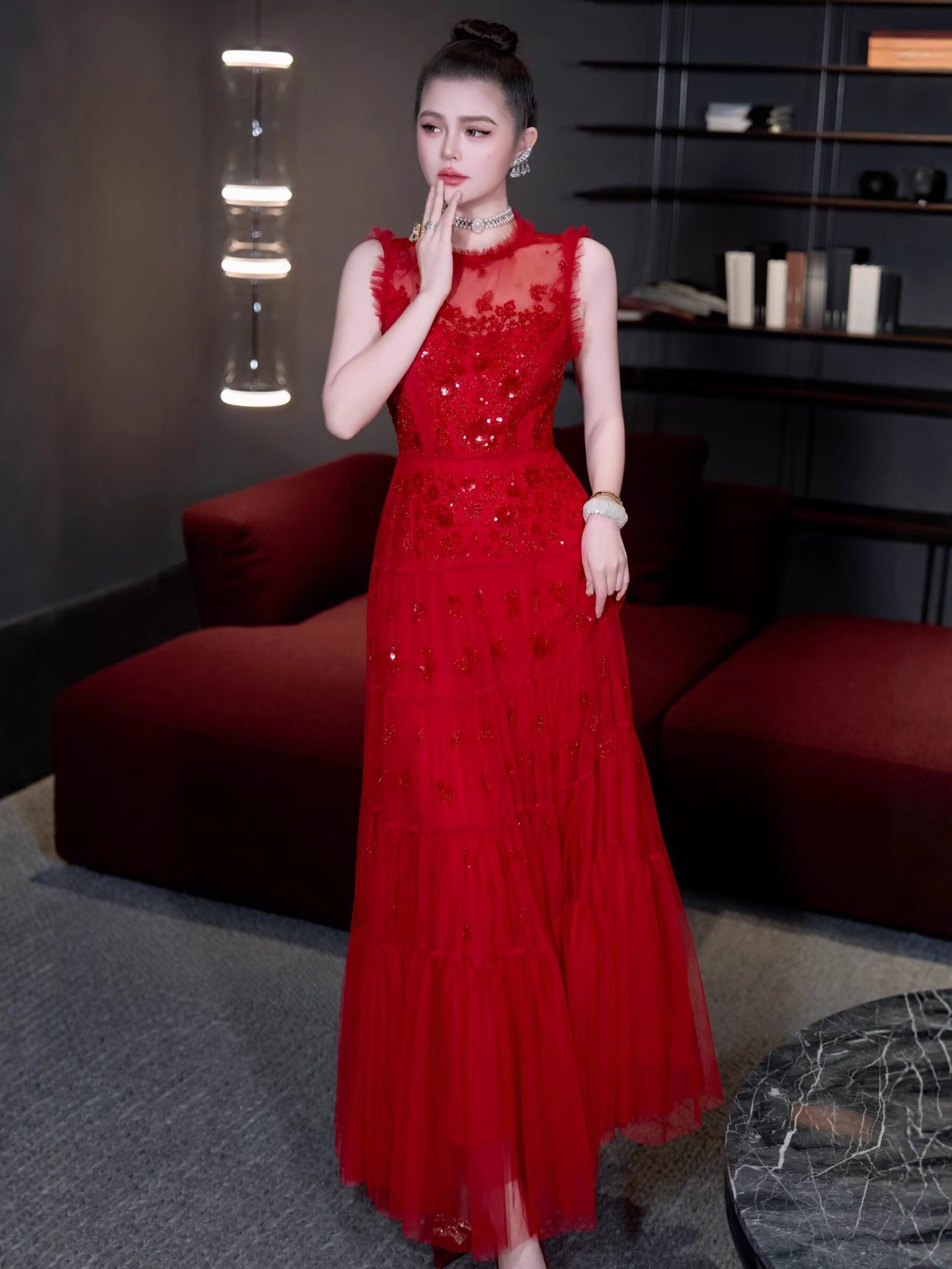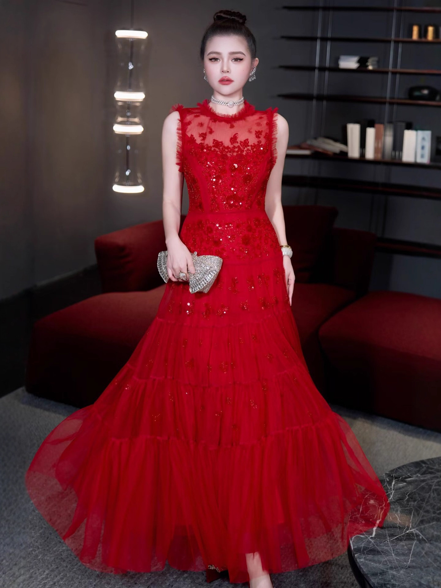 红色结婚伴娘新娘敬酒服 网纱绣珠亮片宴会年会主持人晚礼服+黑色