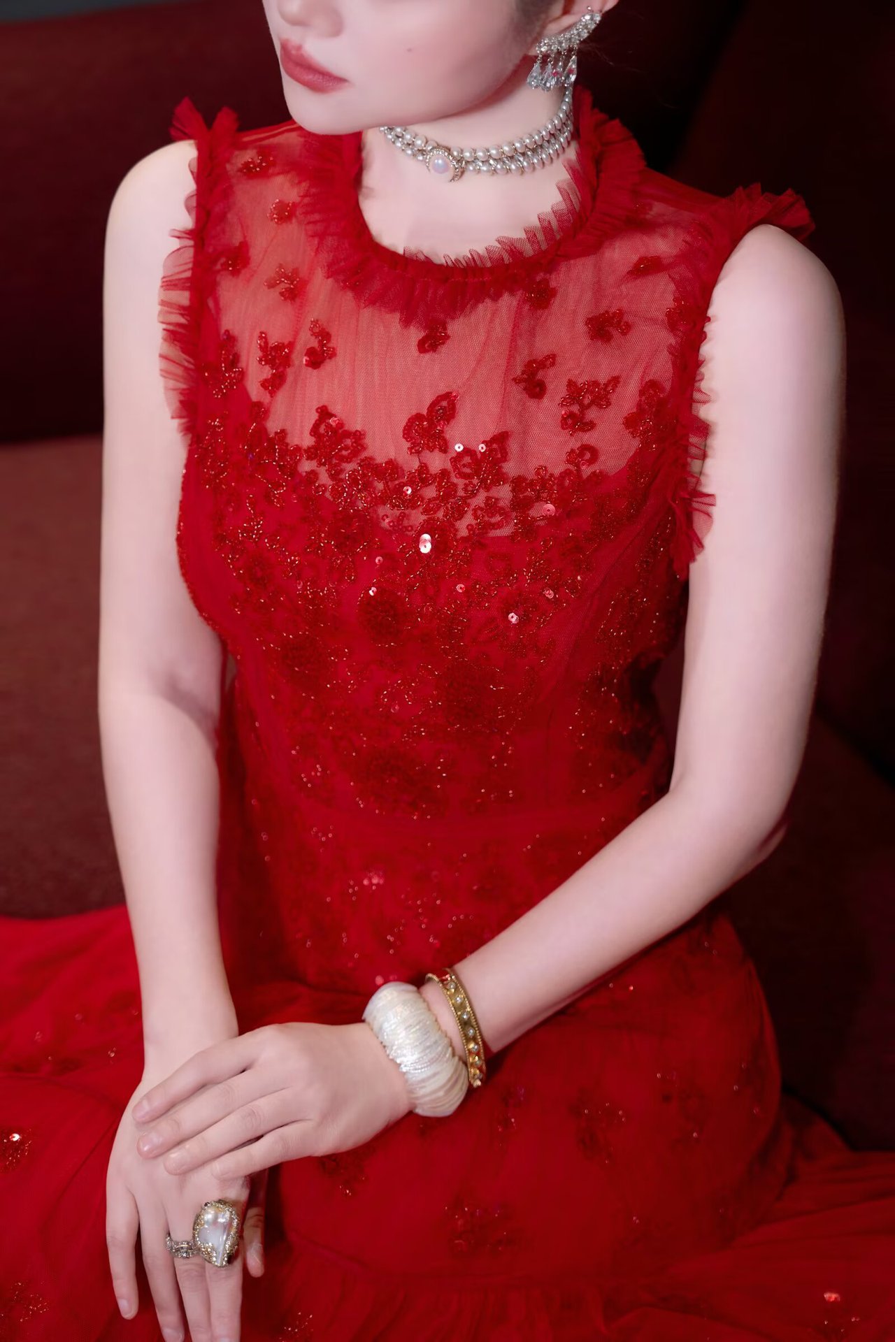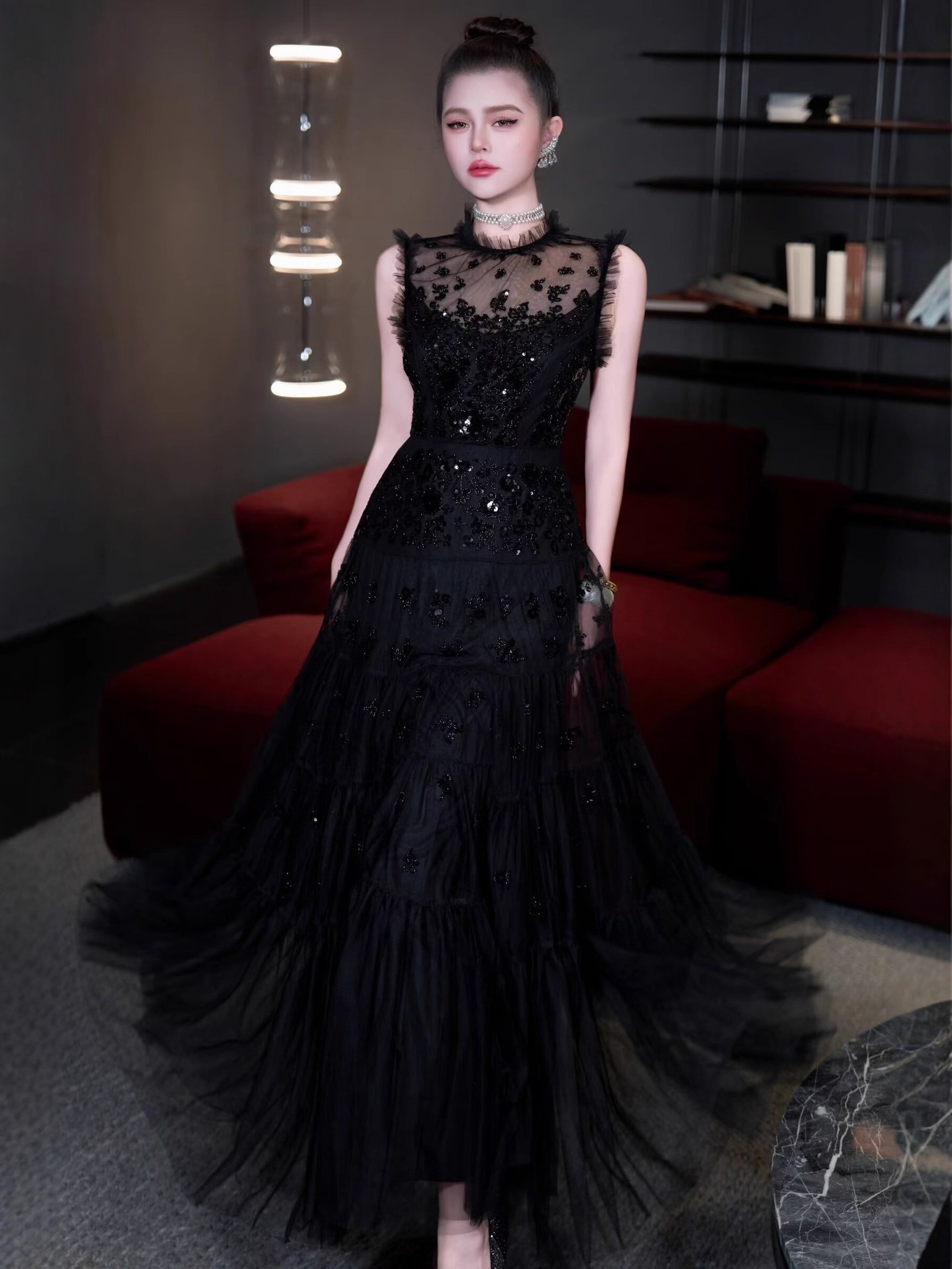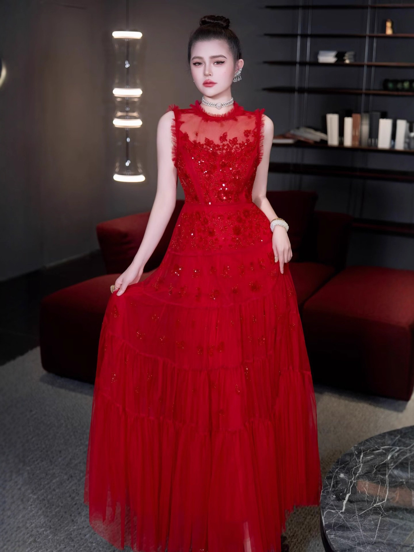 红色结婚伴娘新娘敬酒服 网纱绣珠亮片宴会年会主持人晚礼服+黑色