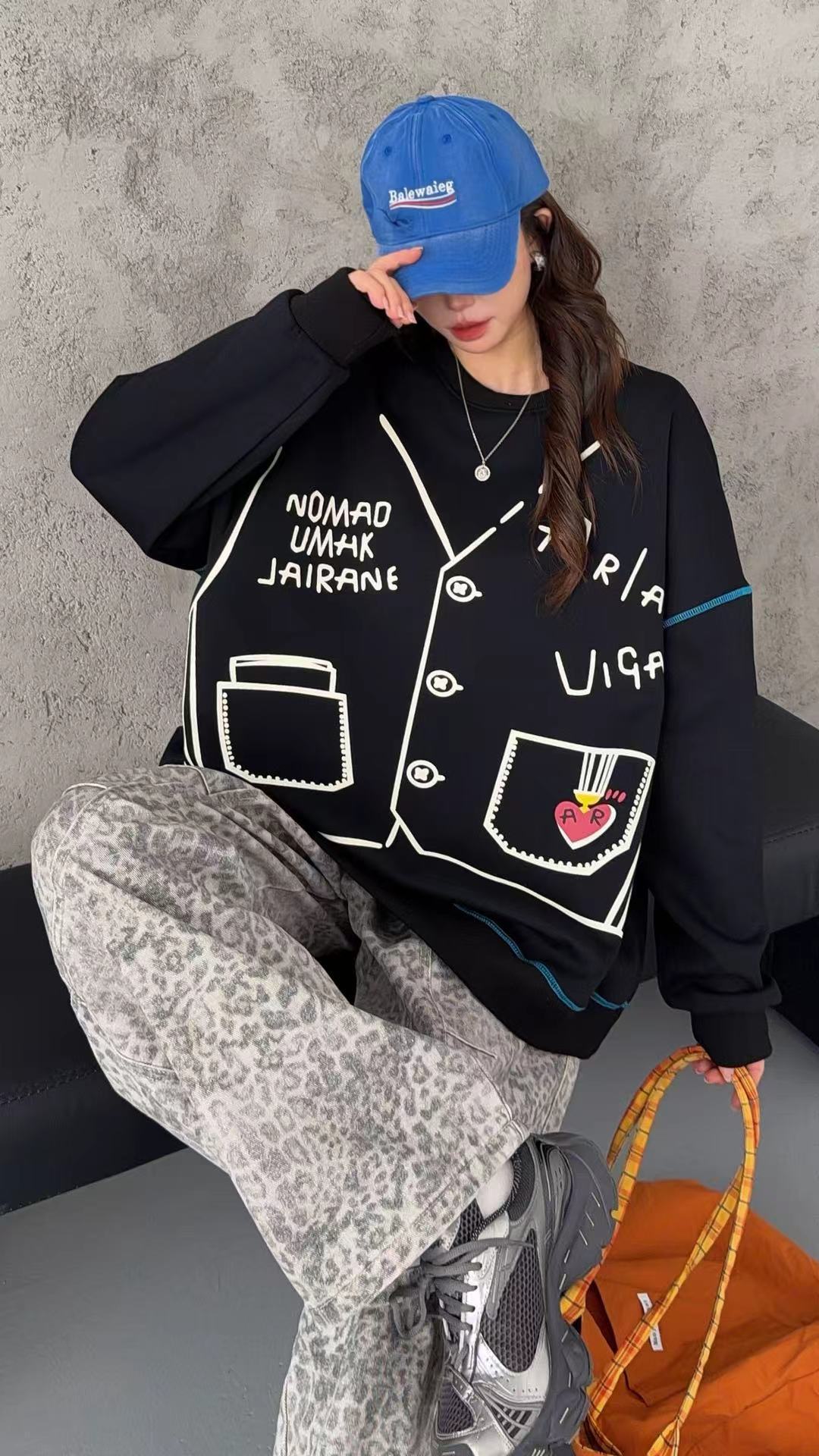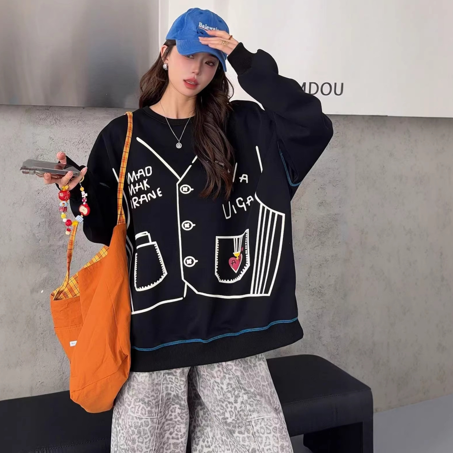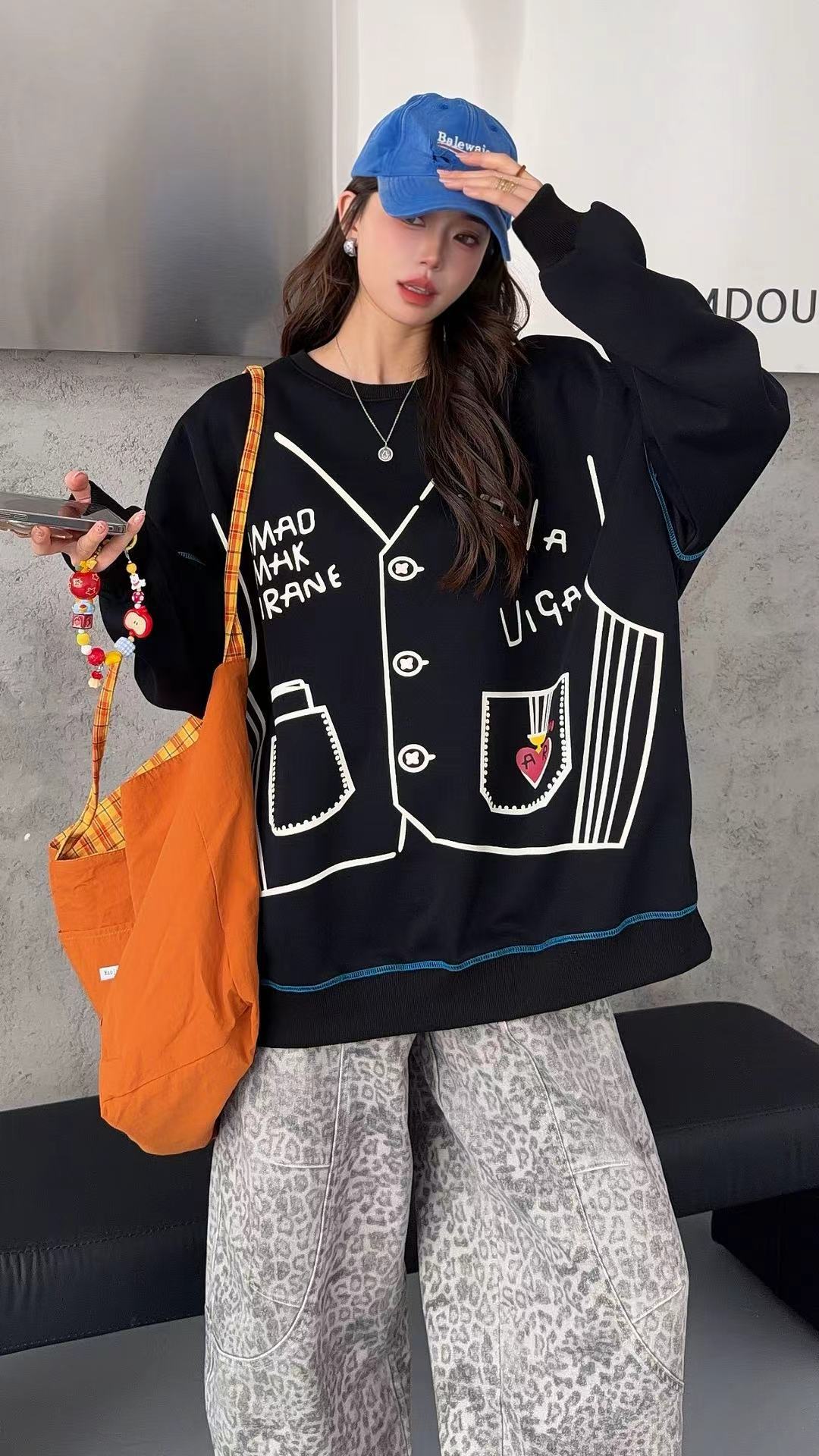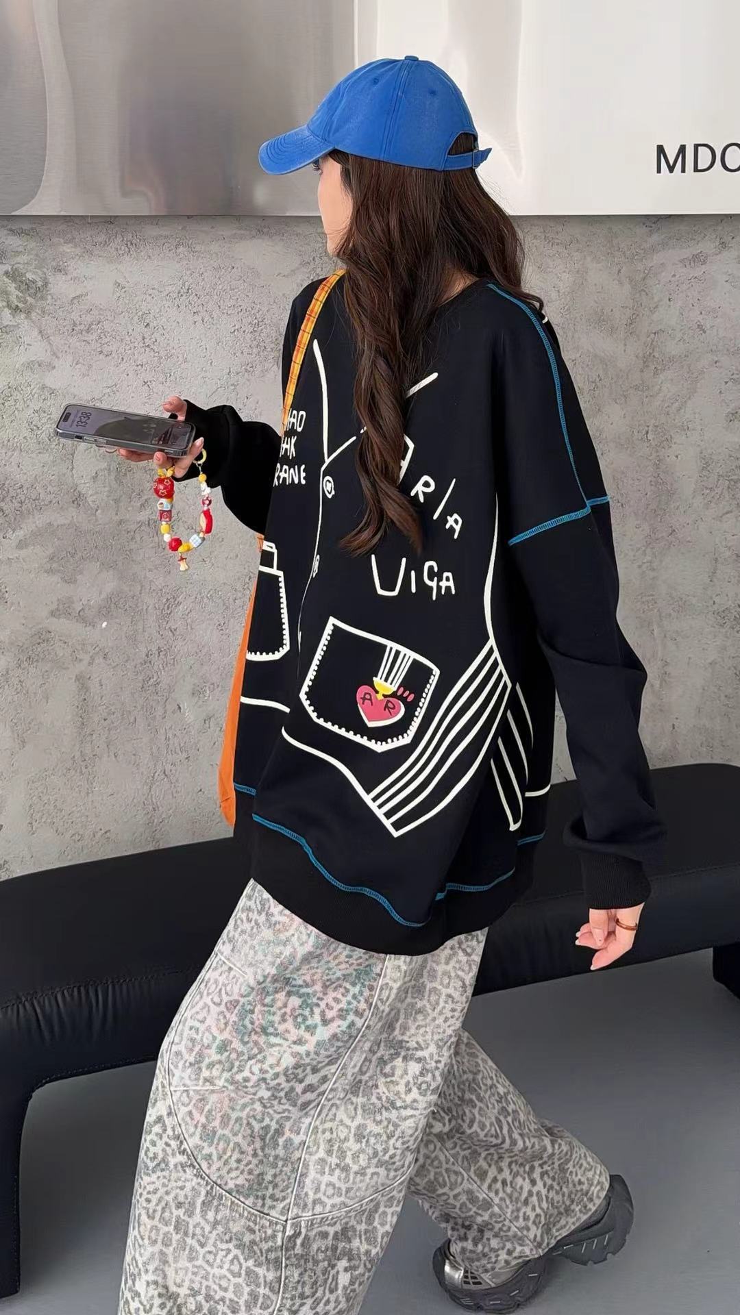 欧货大码涂鸦时尚洋气设计感慵懒街头上衣宽松春季新款百搭卫衣女