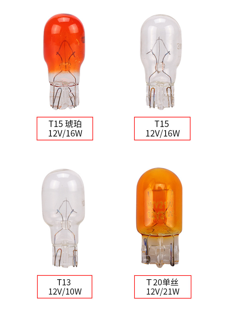T5白色(12V1.2W ); T5琥珀色(12V1.2W ); T5(24V1.2W ); T10白色(12V/5W); T10琥珀色(12V/5W); T10 (24V5W); T13白色(12V/10W); T13琥珀色(12V/10W); T15白色(12V/16W); T15琥珀色(12V/16W); T20白色单丝(12V/21W); T20白色双丝(12V21/5W); T20琥珀色单丝(12V/21W); T20琥珀色双丝(12V21/5W)