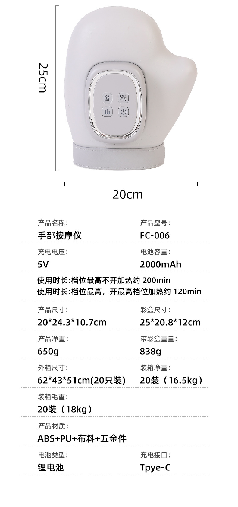 产品名称: 手部按摩仪 产品型号: FC-006 充电电压: 5V