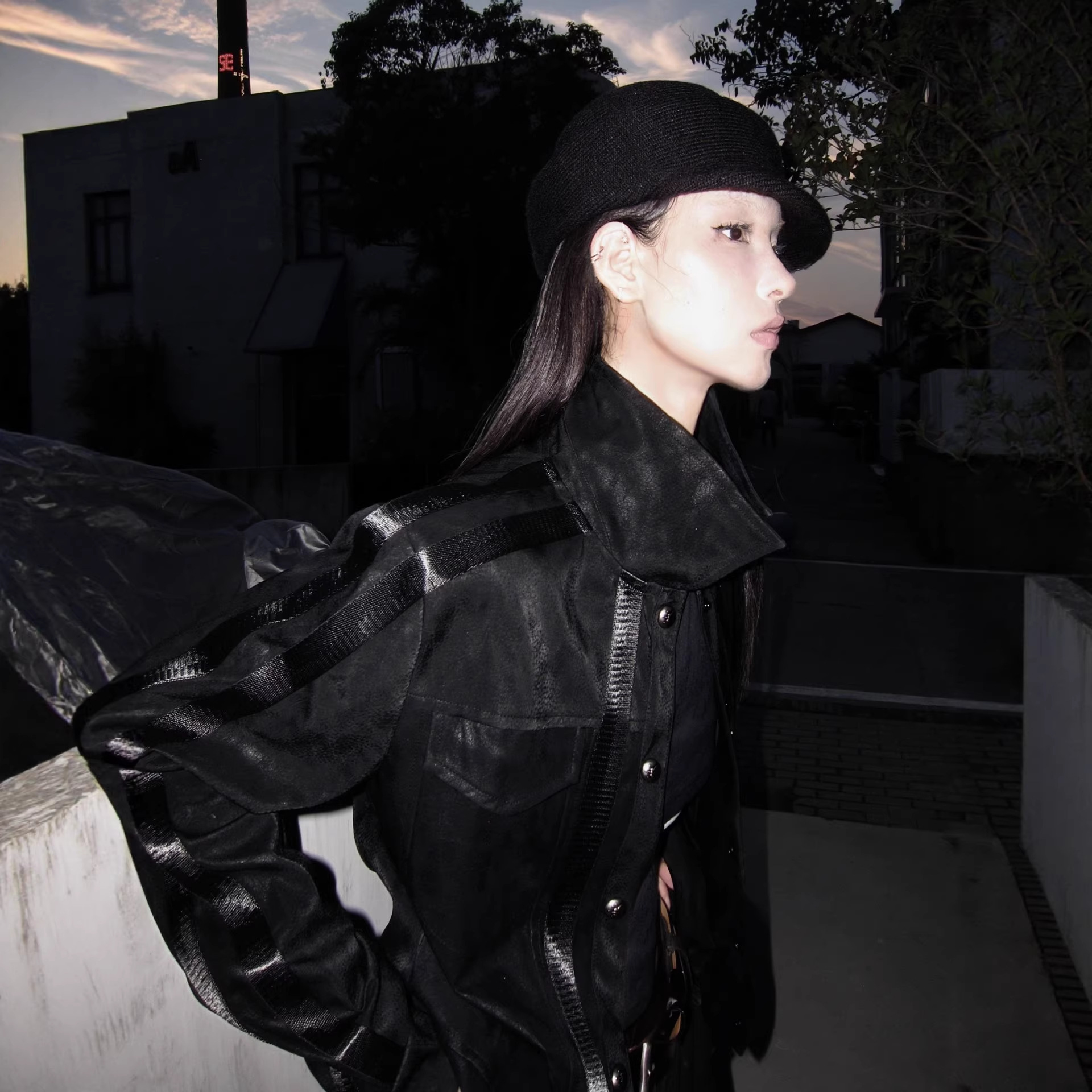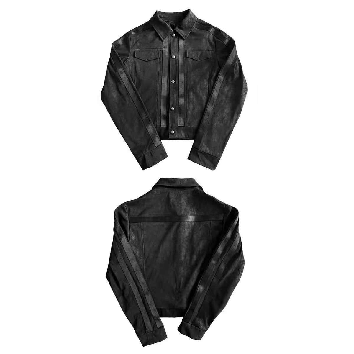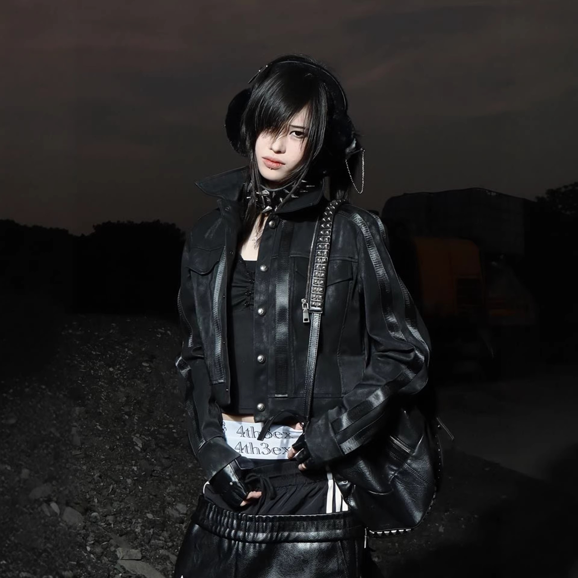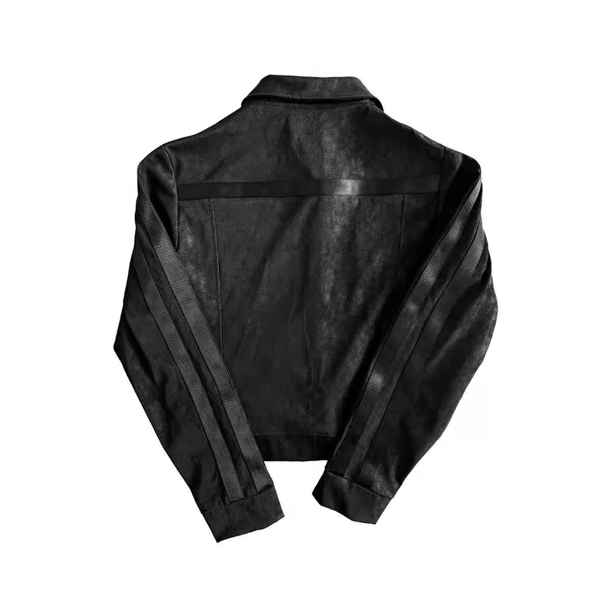 街头风朋克皮衣夹克女秋冬条纹拼接黑色正肩外套视觉系修身上衣潮