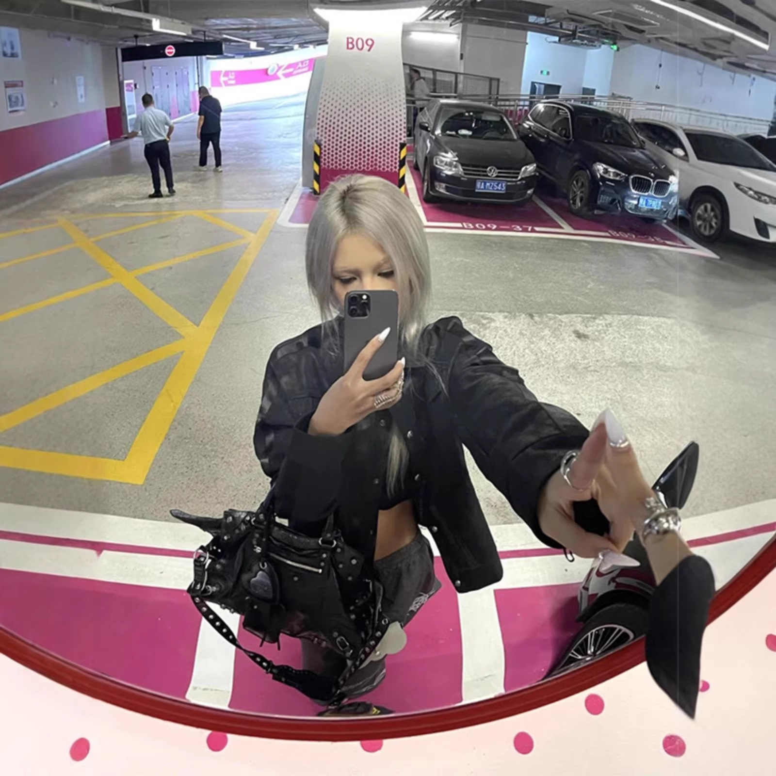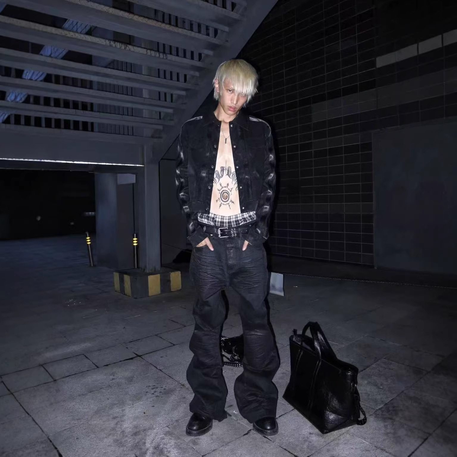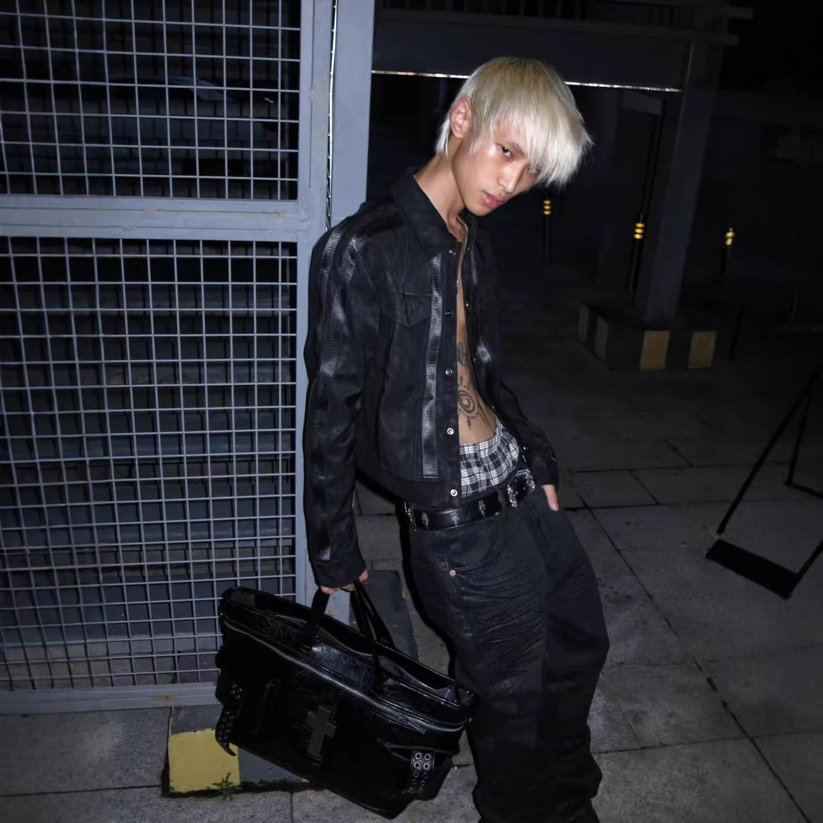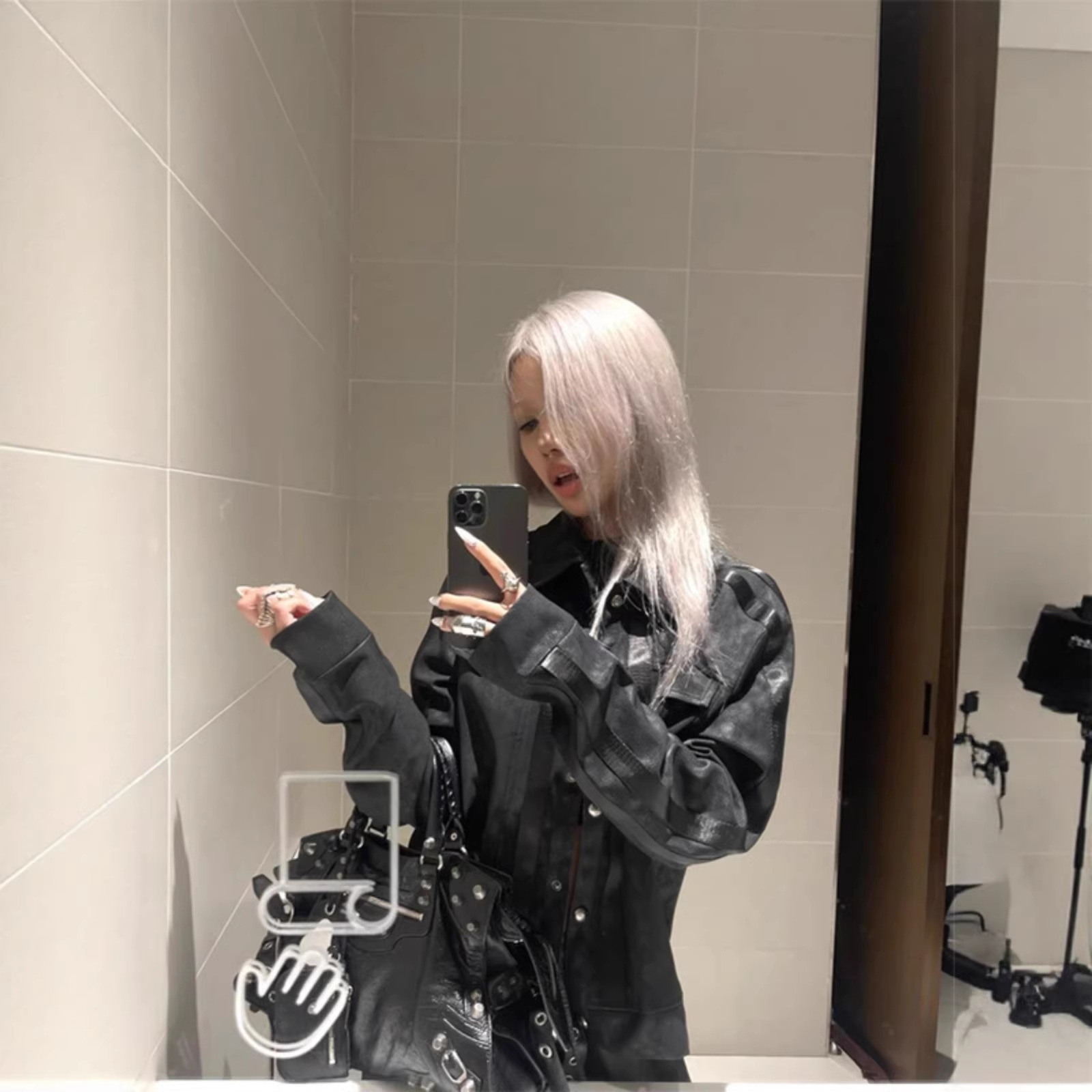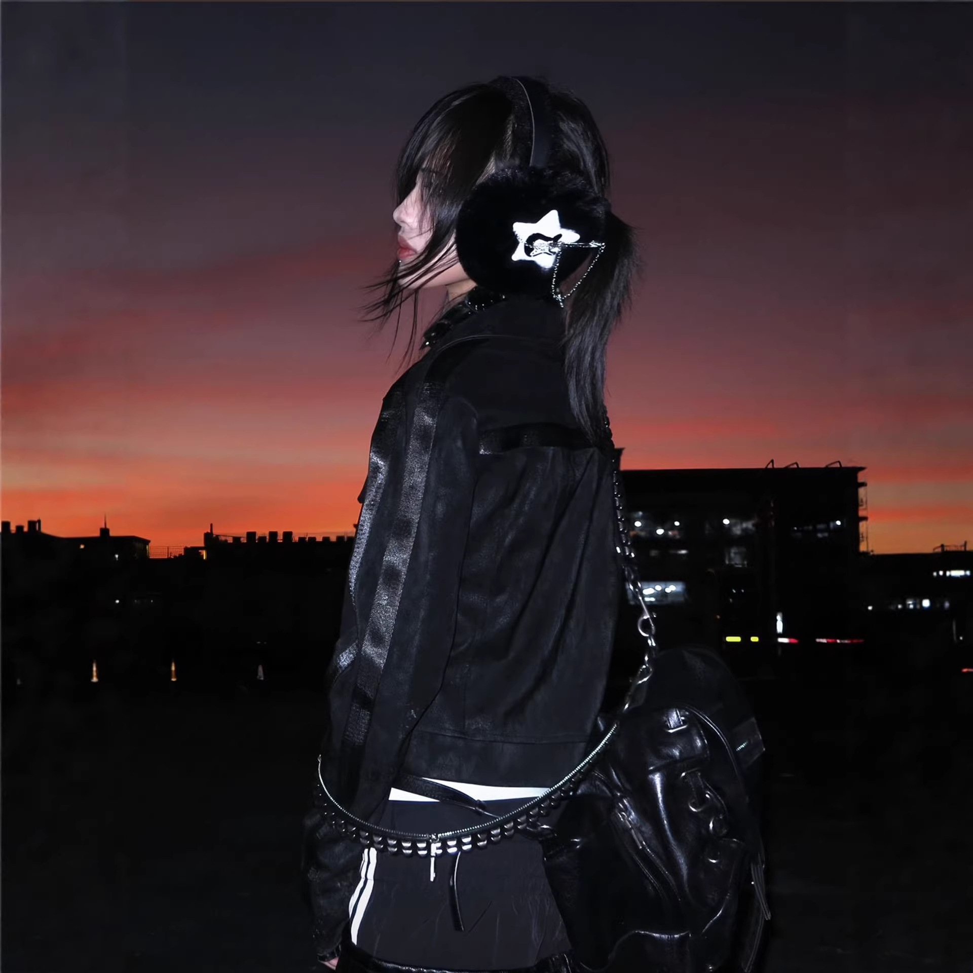 街头风朋克皮衣夹克女秋冬条纹拼接黑色正肩外套视觉系修身上衣潮