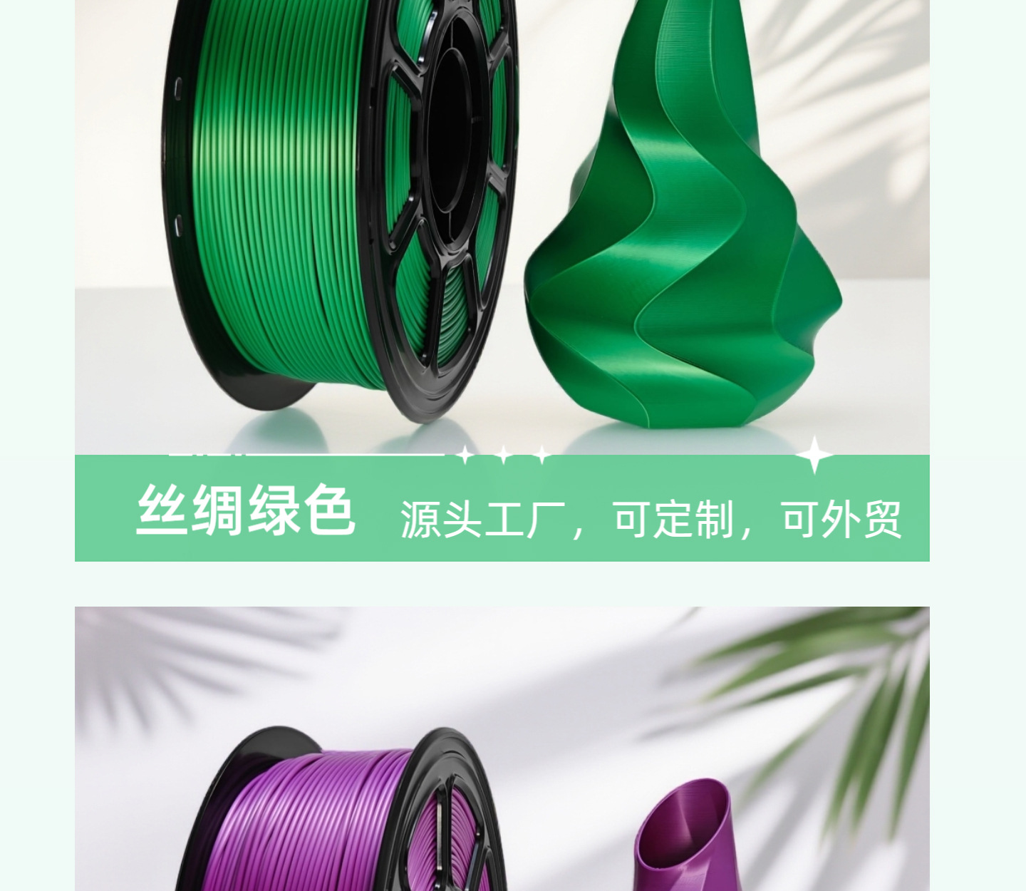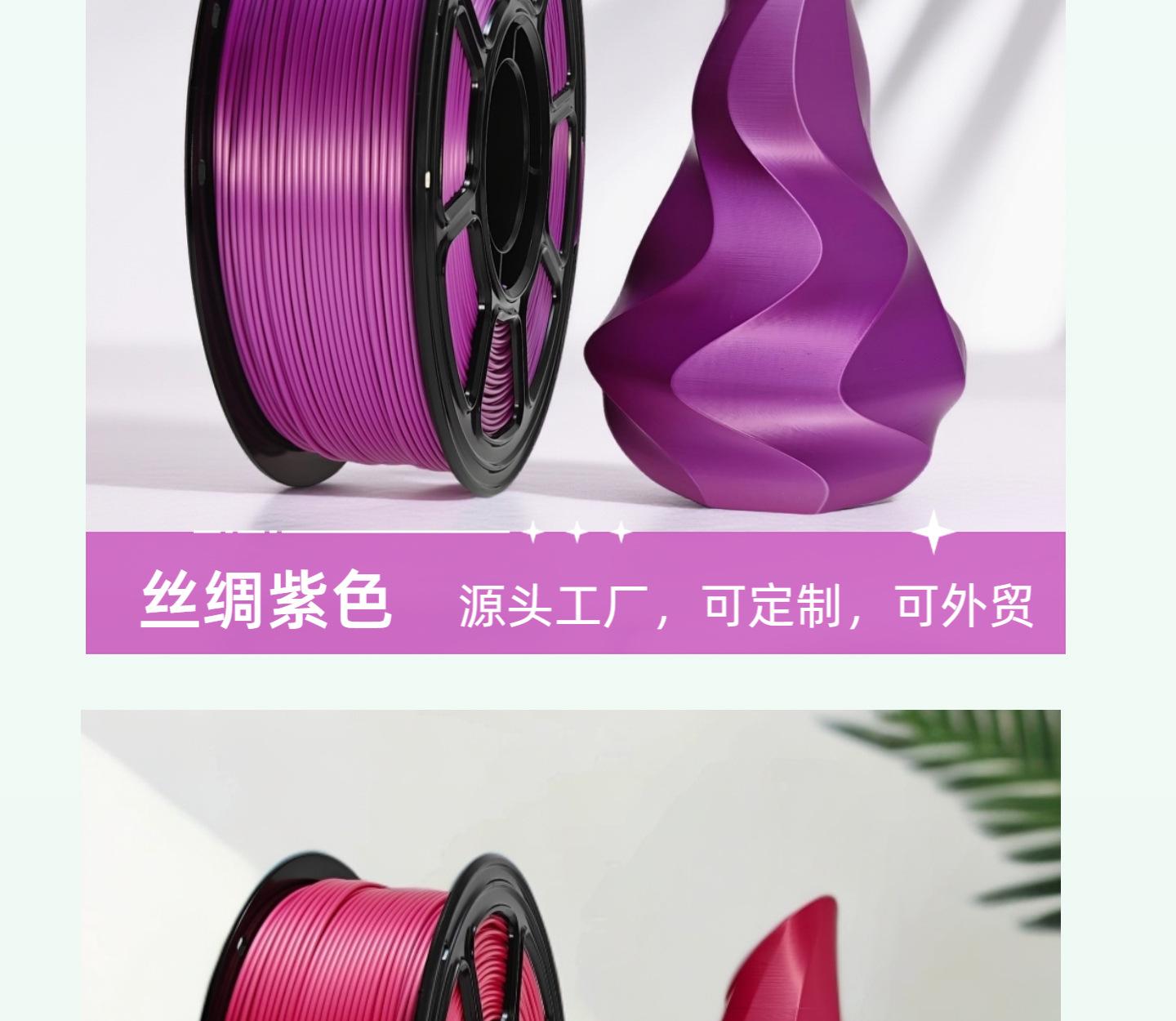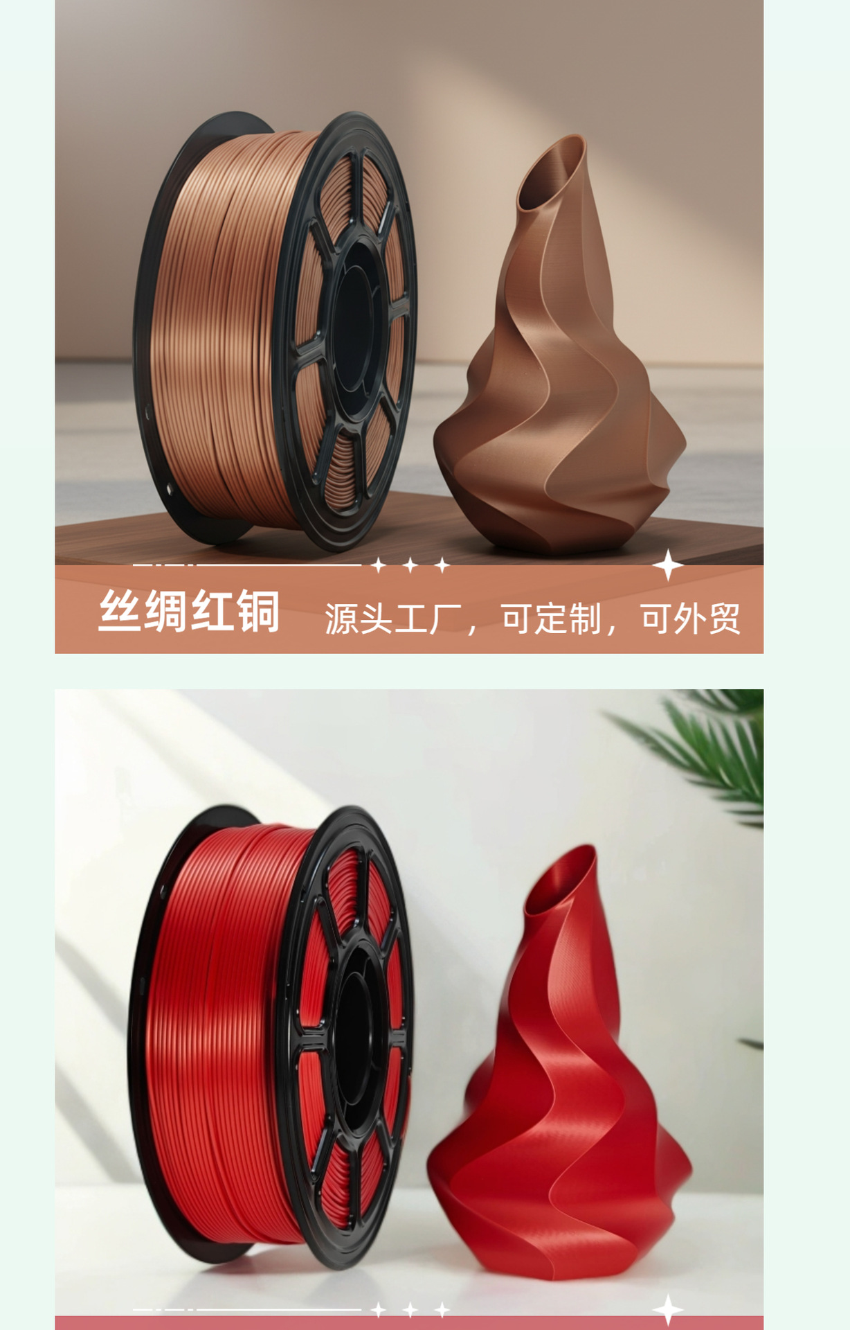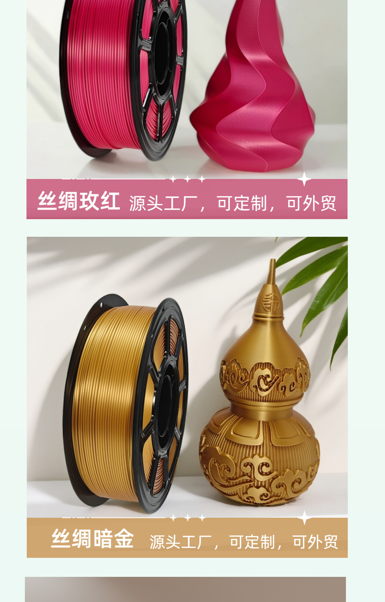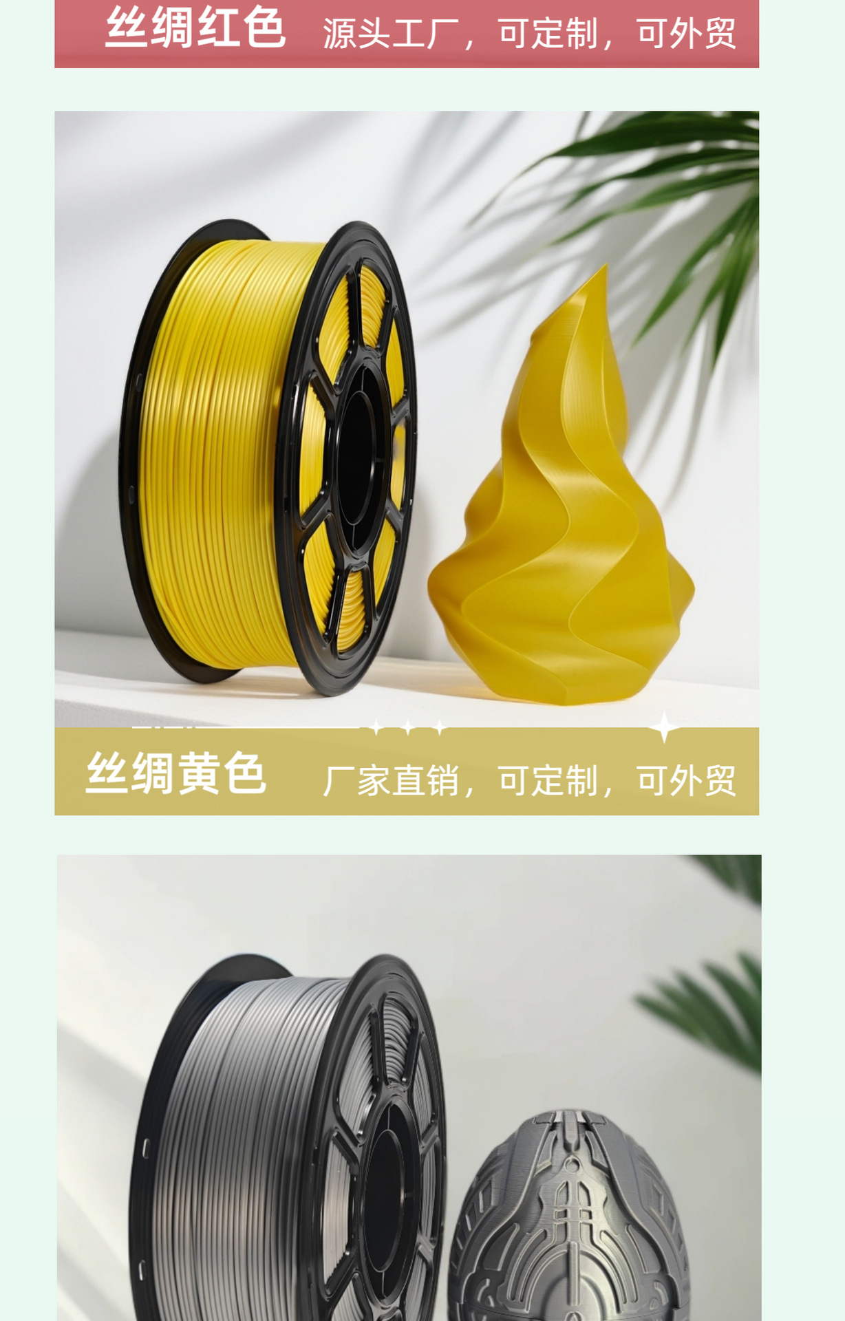 PLA+丝绸白色; PLA+丝绸黑色; PLA+丝绸红色; PLA+丝绸玫红; PLA+丝绸粉色; PLA+丝绸黄色; PLA+丝绸天蓝色; PLA+丝绸深蓝色; PLA+丝绸紫色; PLA+丝绸亮金; PLA+丝绸暗金; PLA+丝绸青铜; PLA+丝绸红铜; PLA+丝绸绿色; PLA+丝绸银色