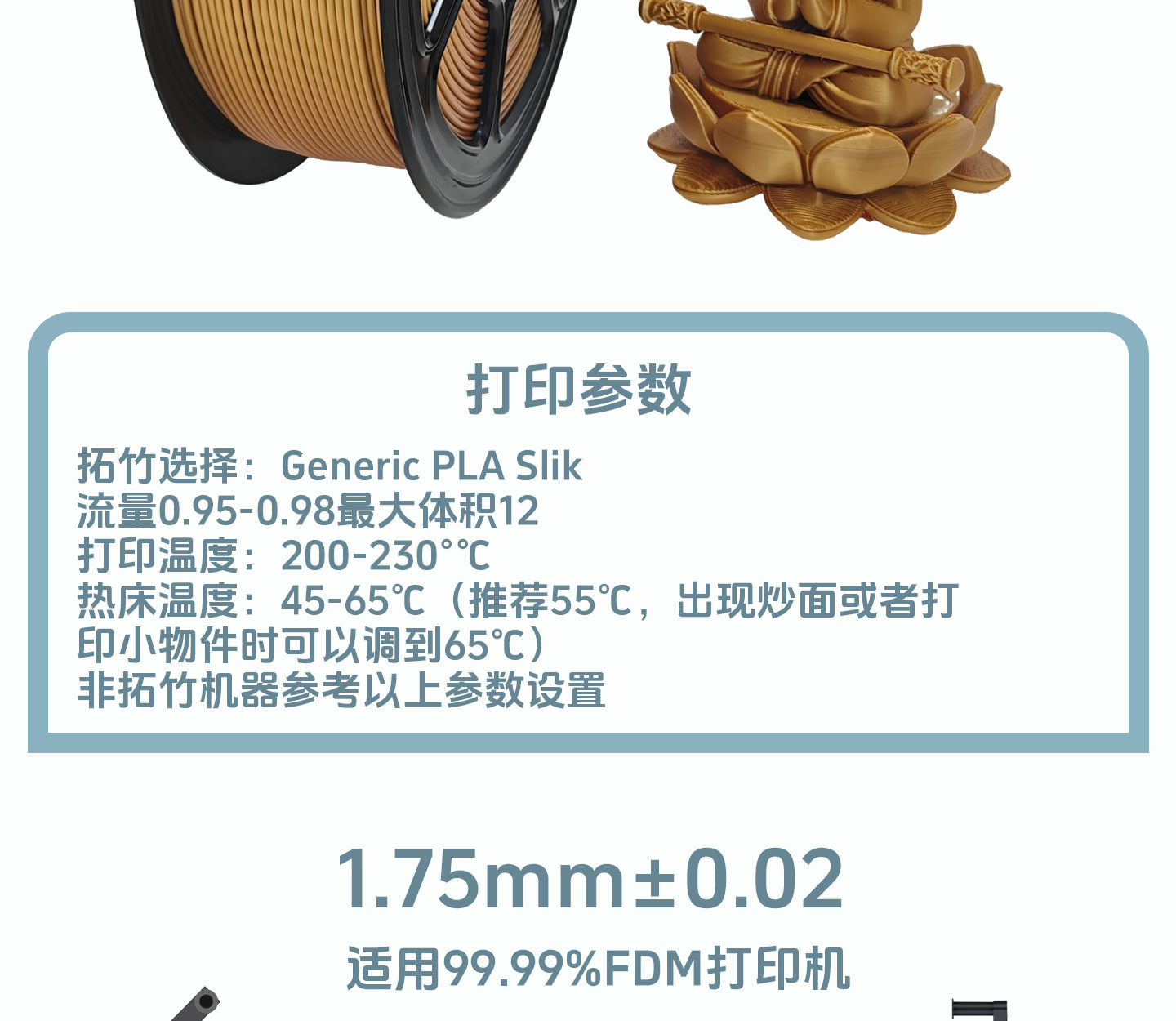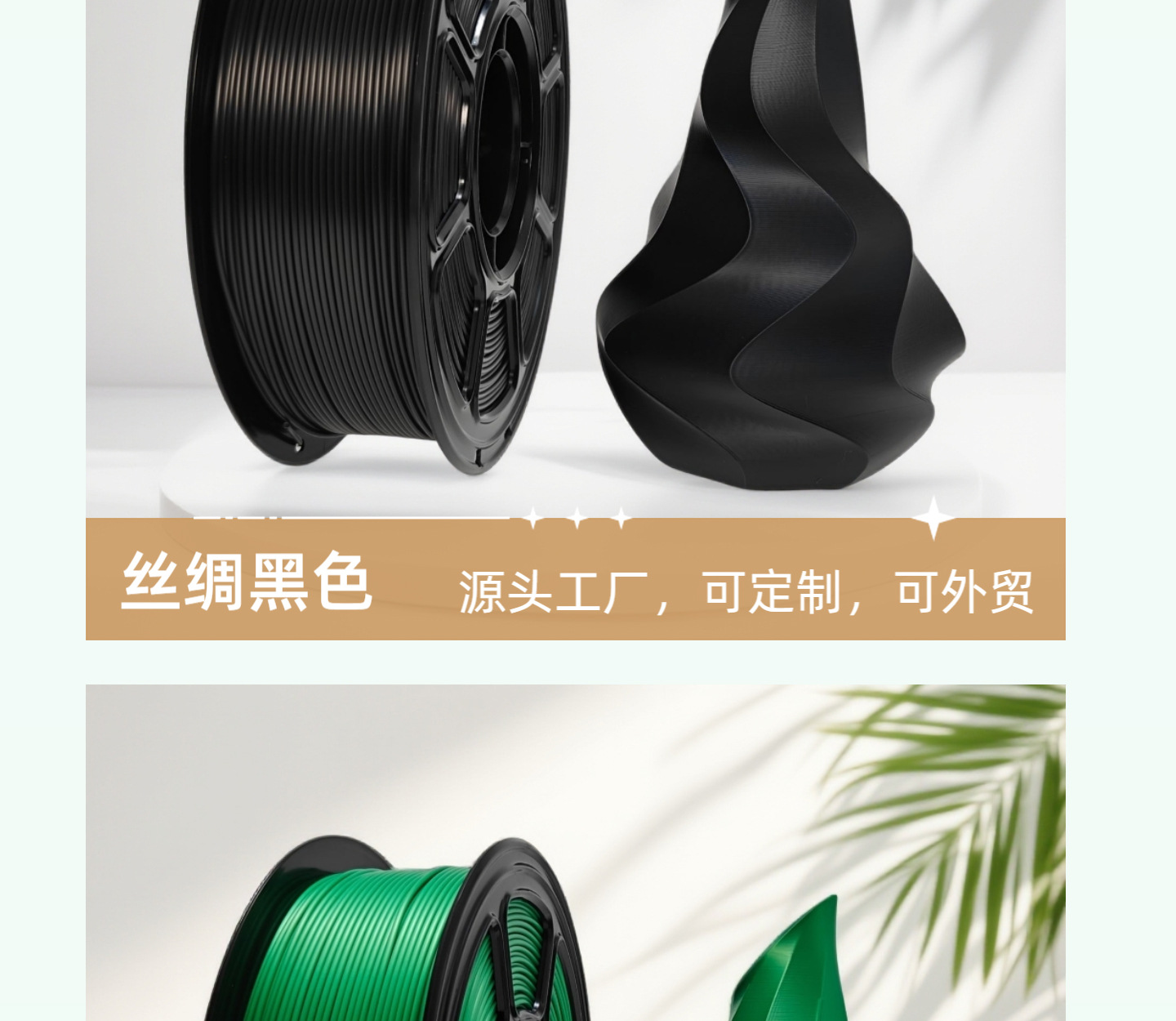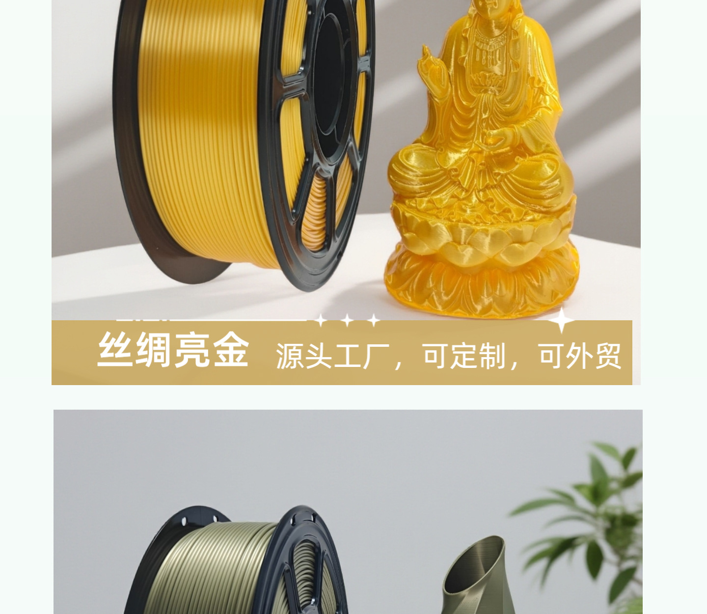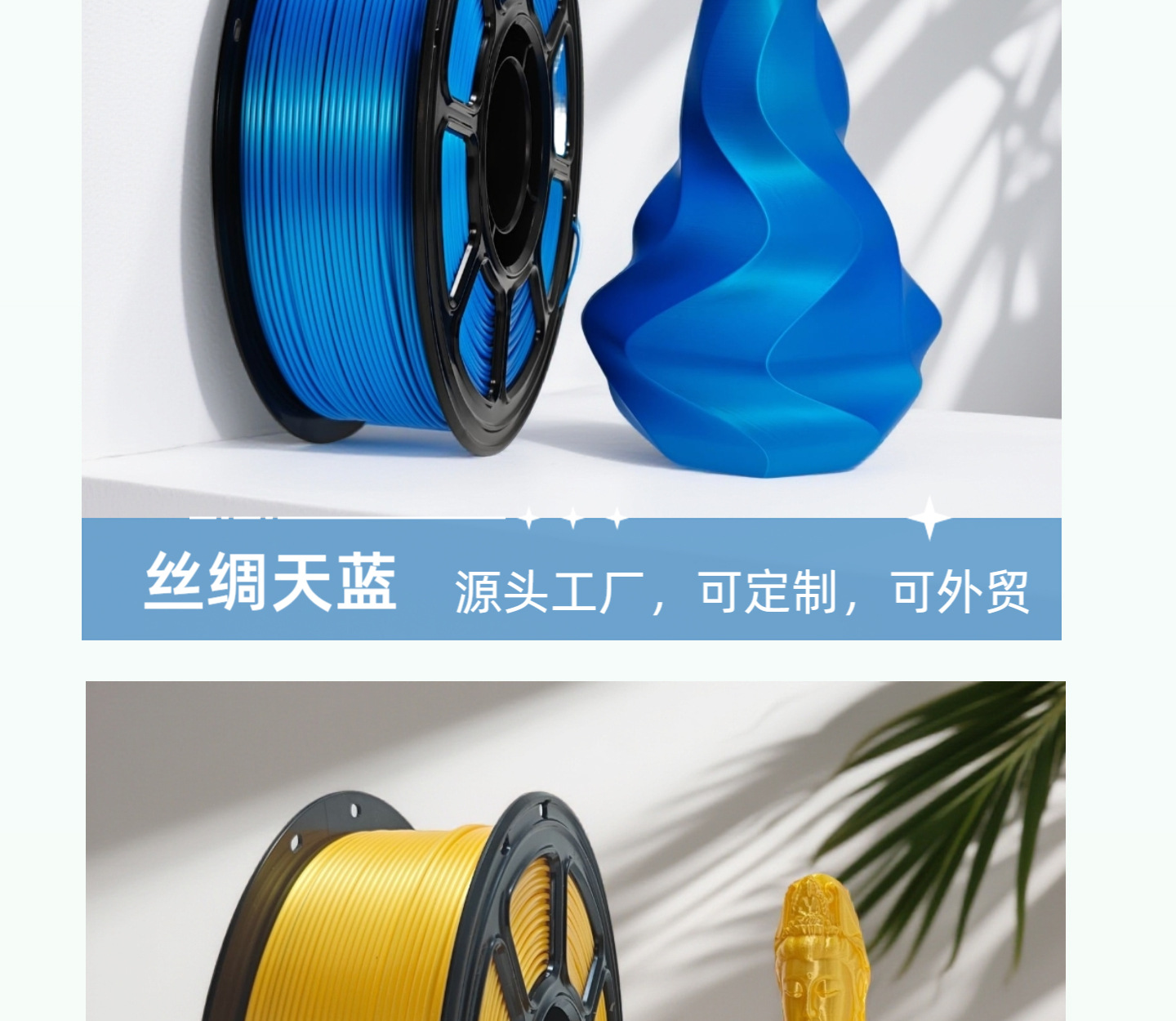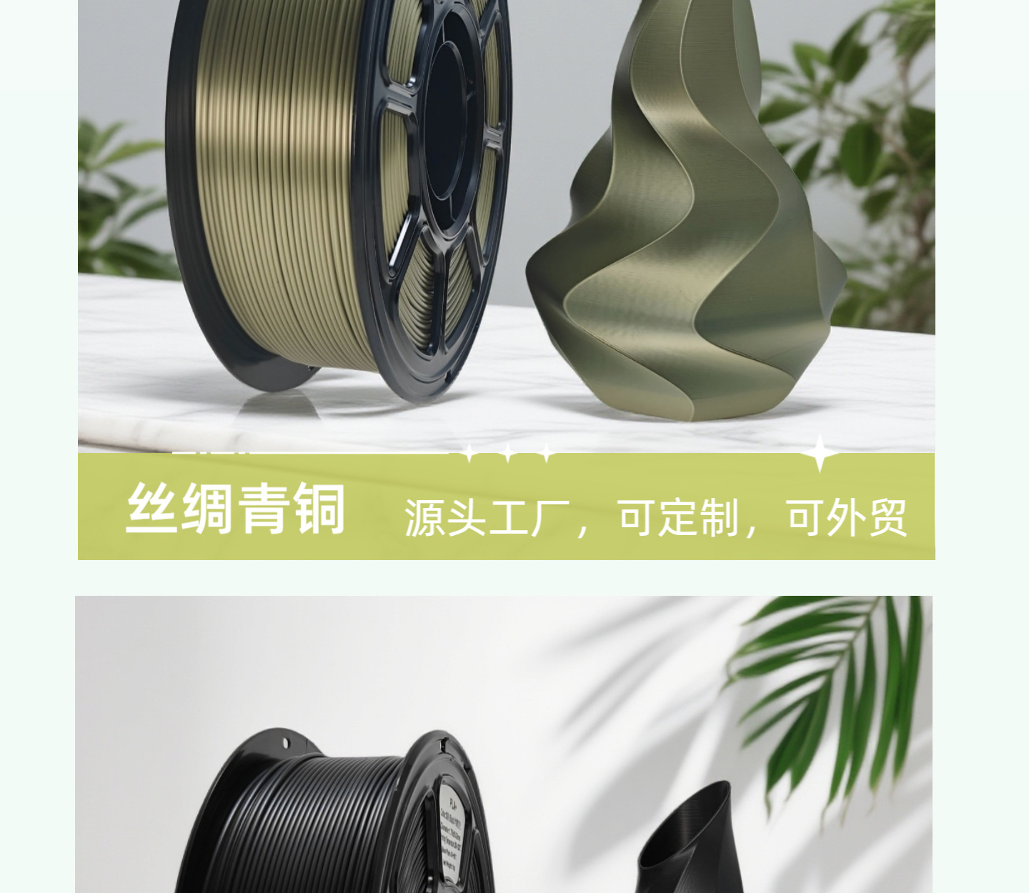 PLA+丝绸白色; PLA+丝绸黑色; PLA+丝绸红色; PLA+丝绸玫红; PLA+丝绸粉色; PLA+丝绸黄色; PLA+丝绸天蓝色; PLA+丝绸深蓝色; PLA+丝绸紫色; PLA+丝绸亮金; PLA+丝绸暗金; PLA+丝绸青铜; PLA+丝绸红铜; PLA+丝绸绿色; PLA+丝绸银色