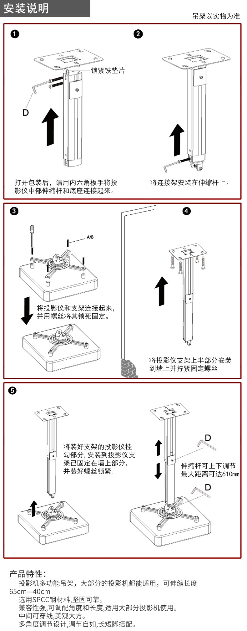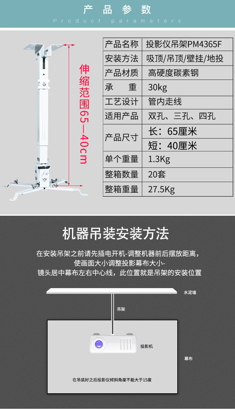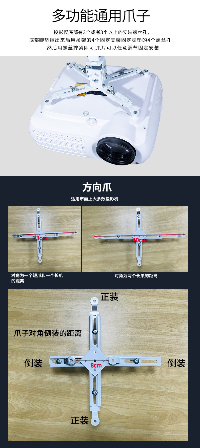 投影仪吊架 43-65CM多功能通用伸缩升降投影机天花吊吸顶壁挂支架