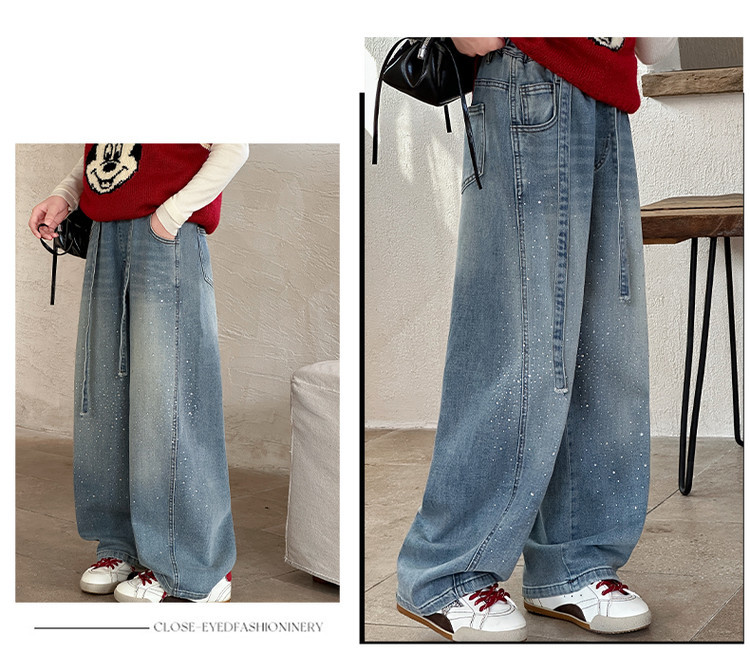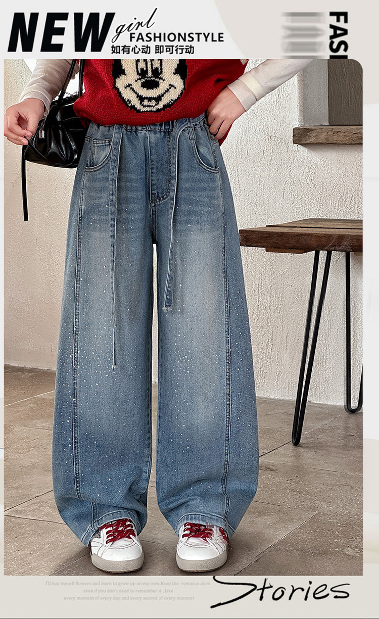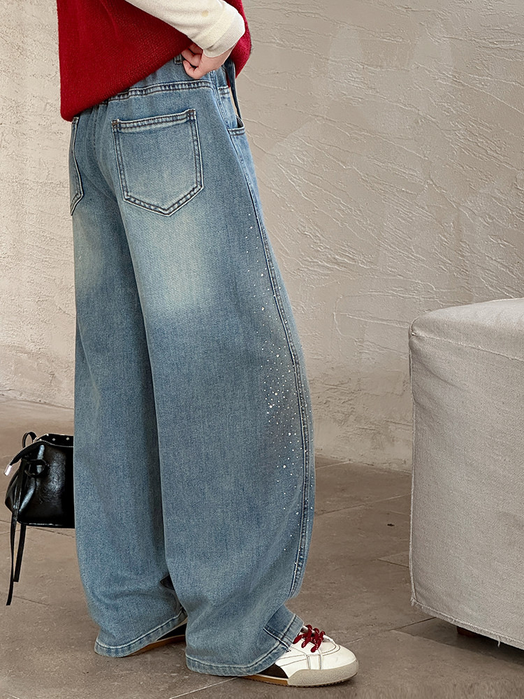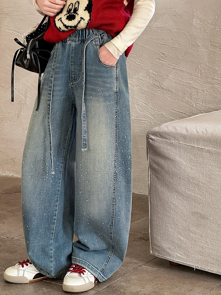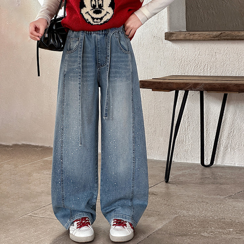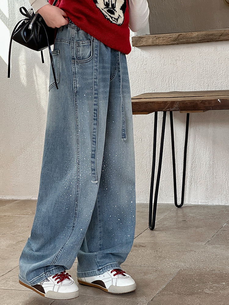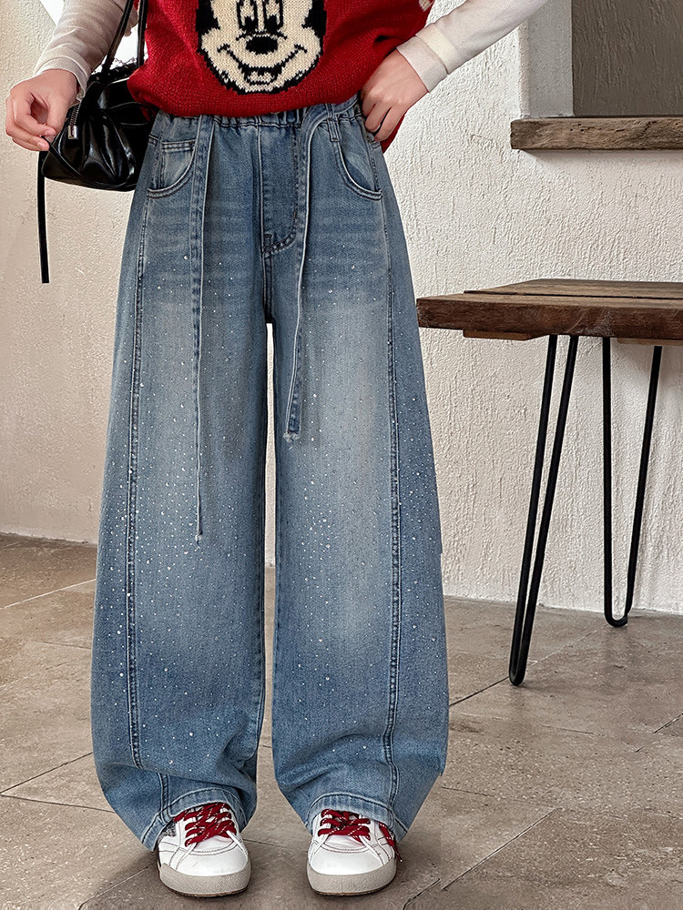 女童裤子牛仔裤阔腿裤女大童直筒裤春秋款2026新款女初中生烫钻潮
