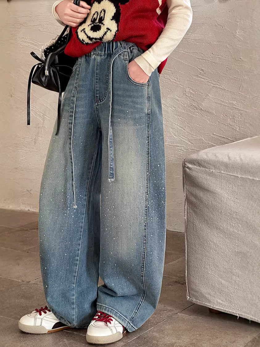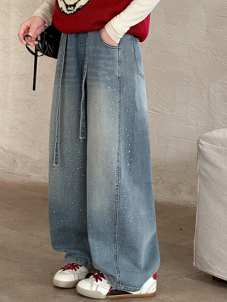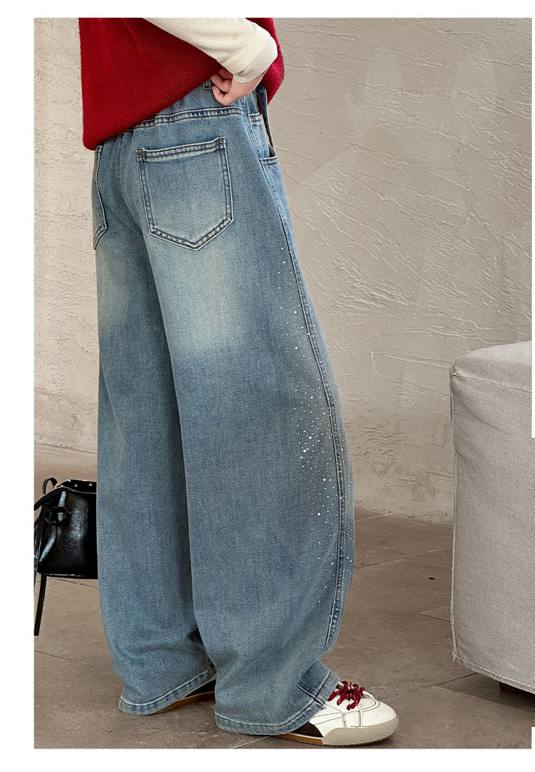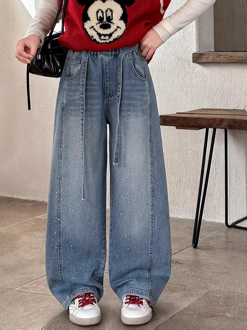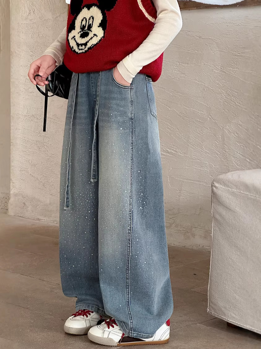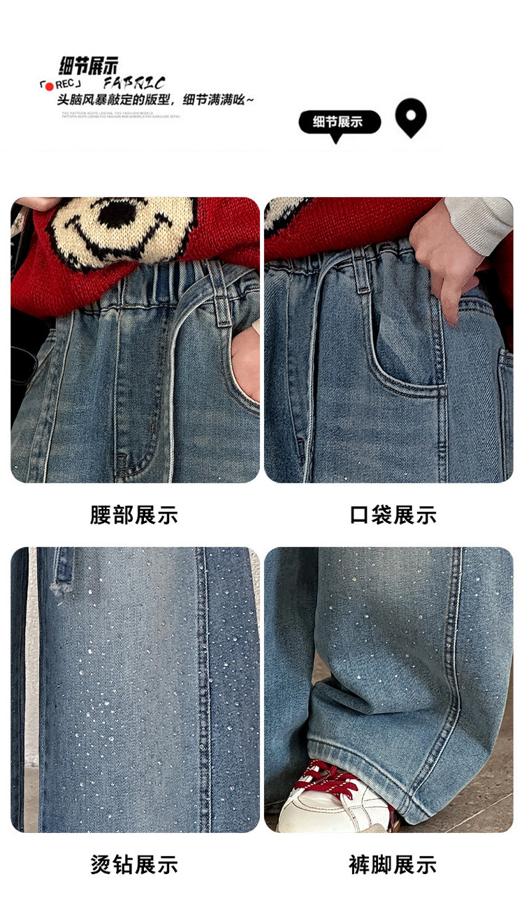 女童裤子牛仔裤阔腿裤女大童直筒裤春秋款2026新款女初中生烫钻潮