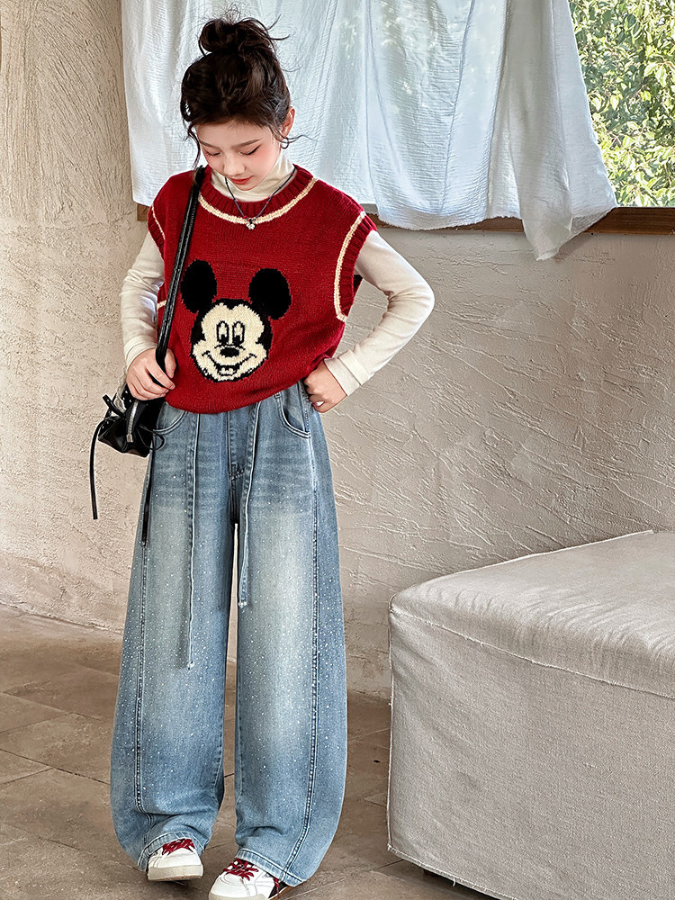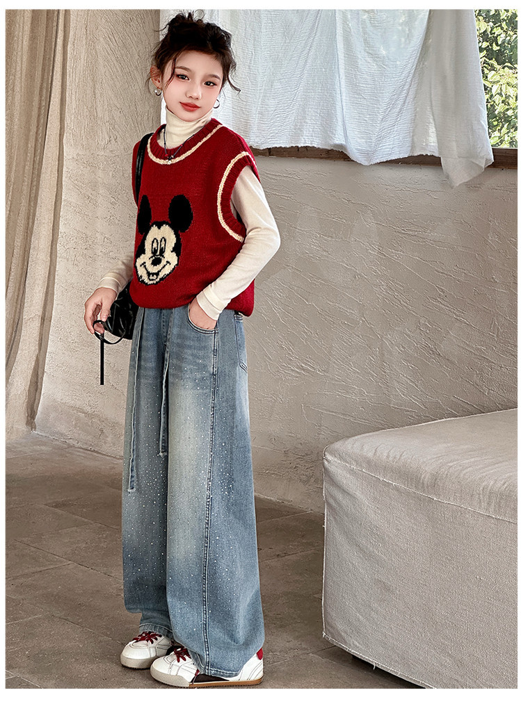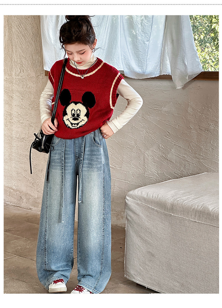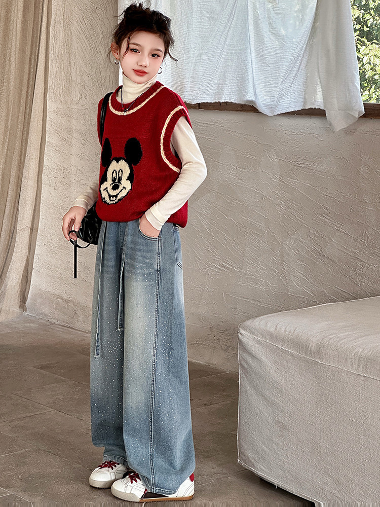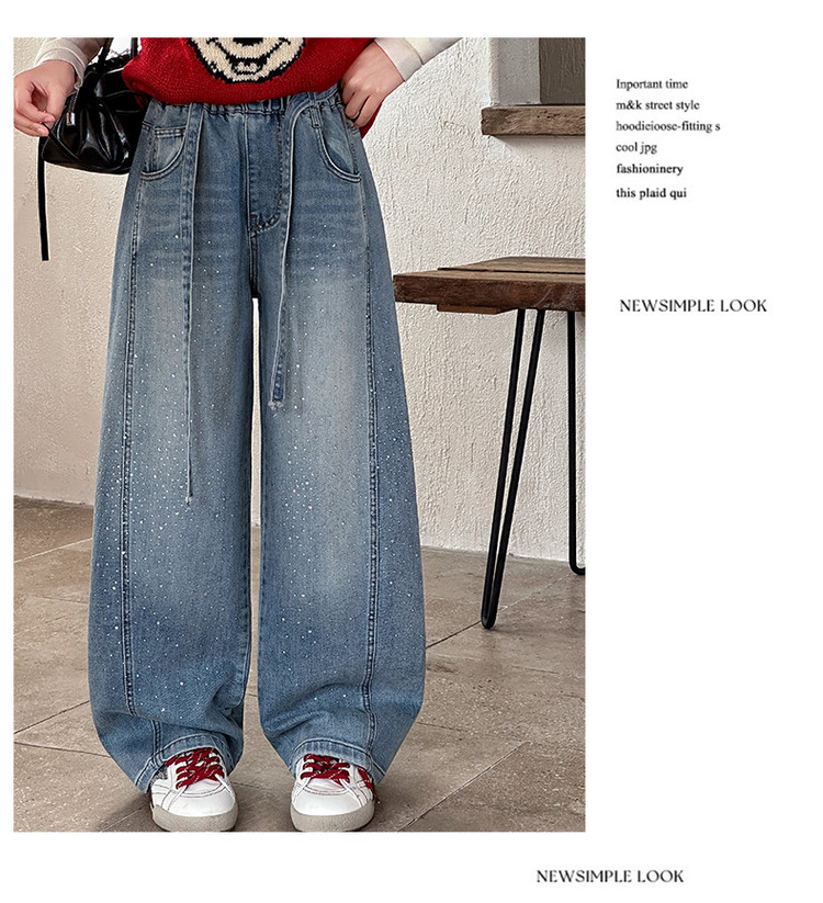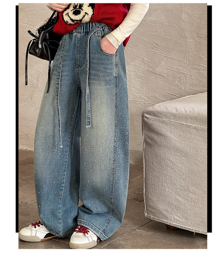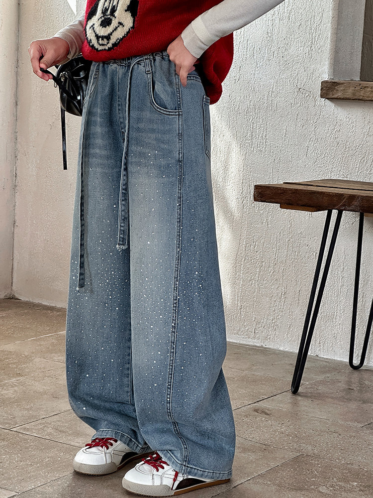 女童裤子牛仔裤阔腿裤女大童直筒裤春秋款2026新款女初中生烫钻潮