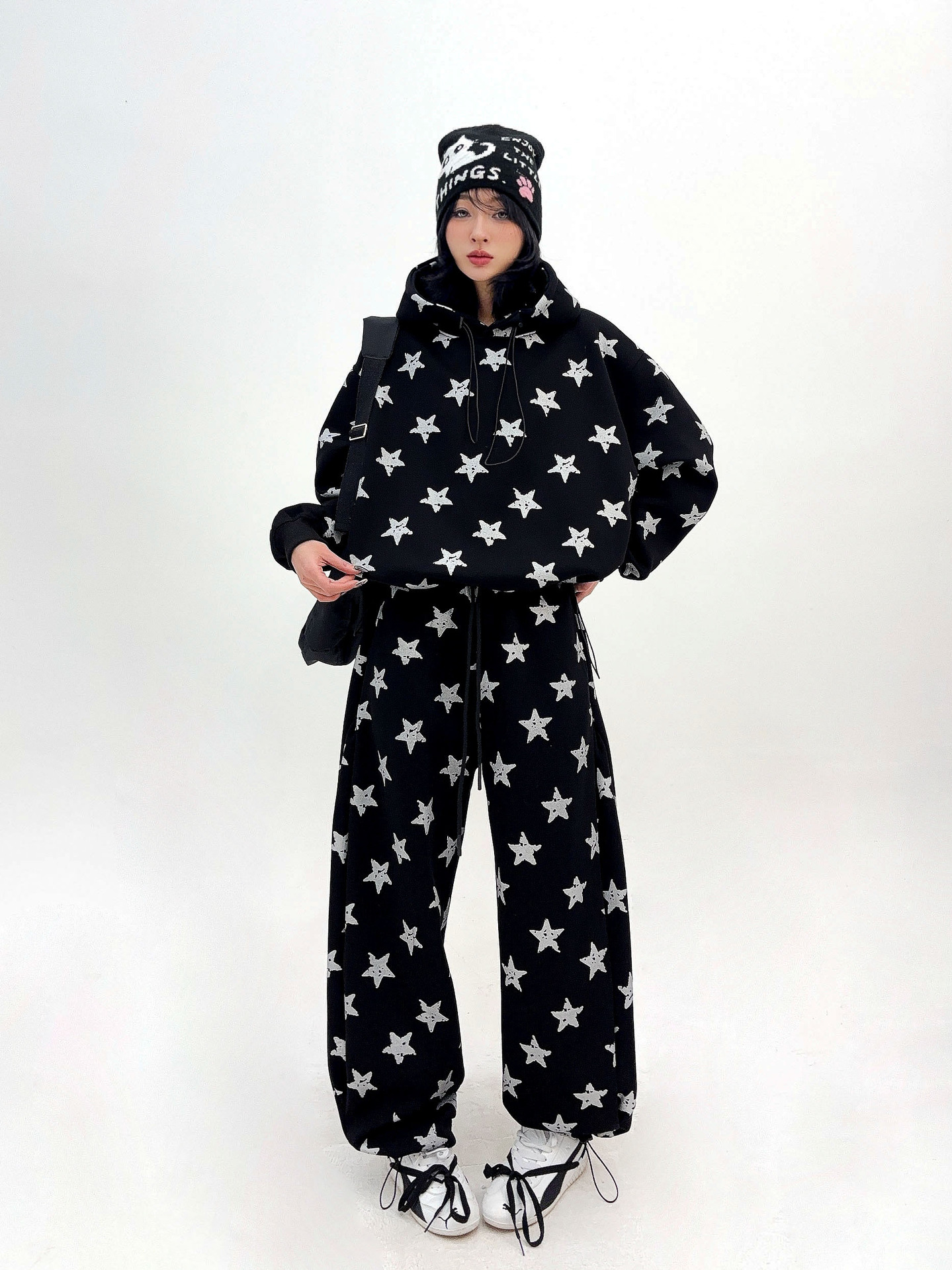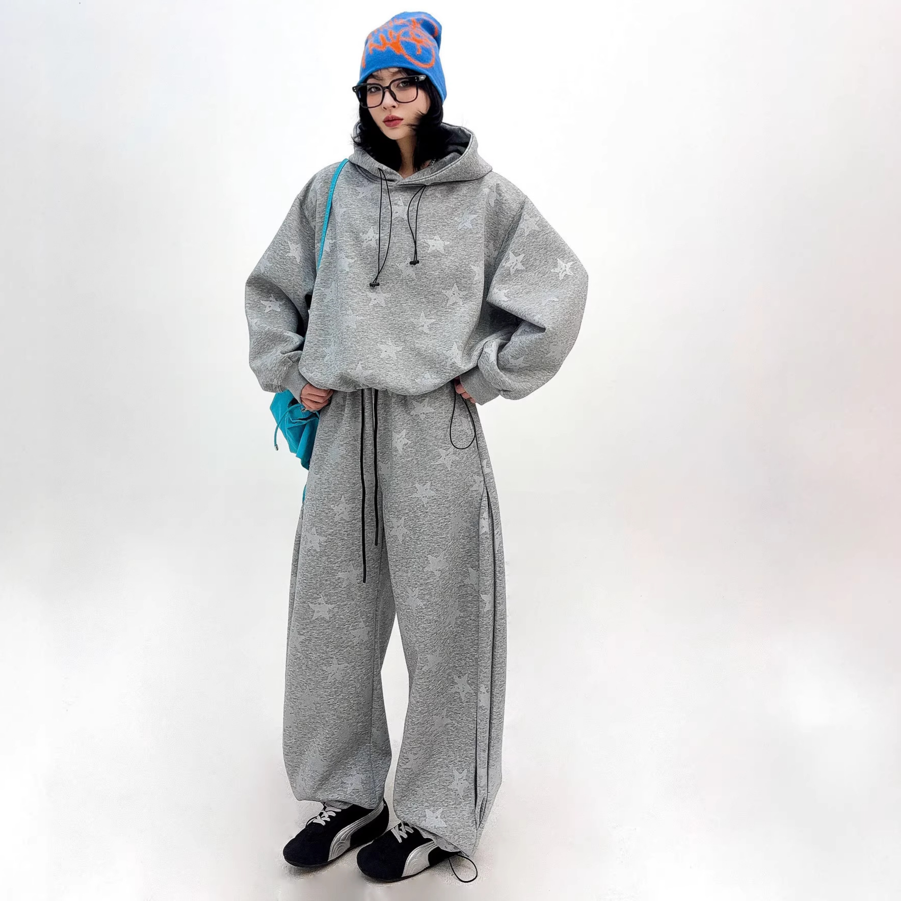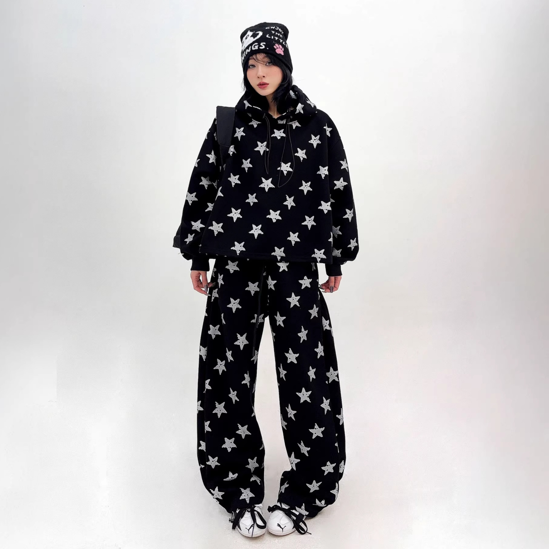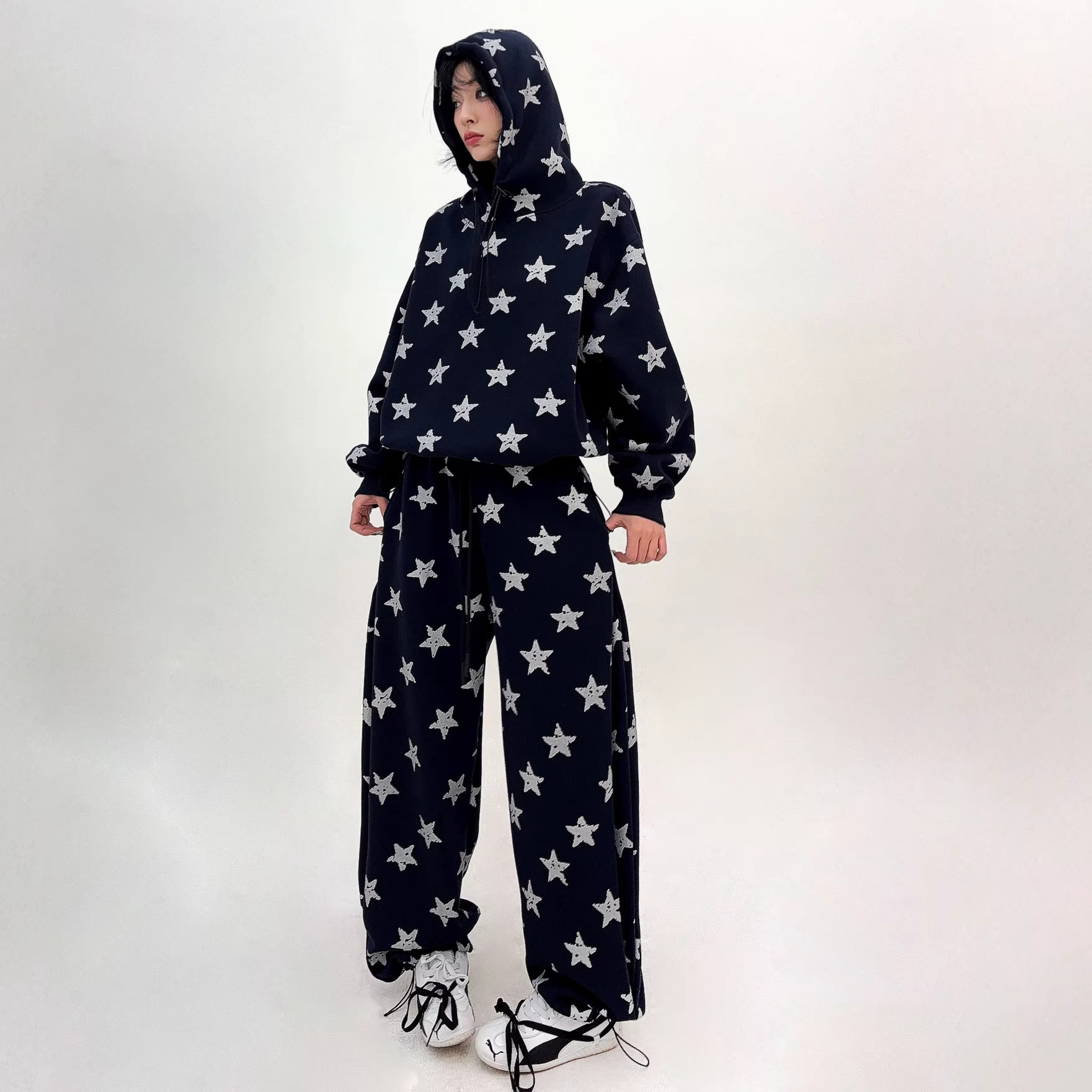 美式时尚套装别致星星满印连帽卫衣弯刀抽绳卫裤女春秋宽松两件套