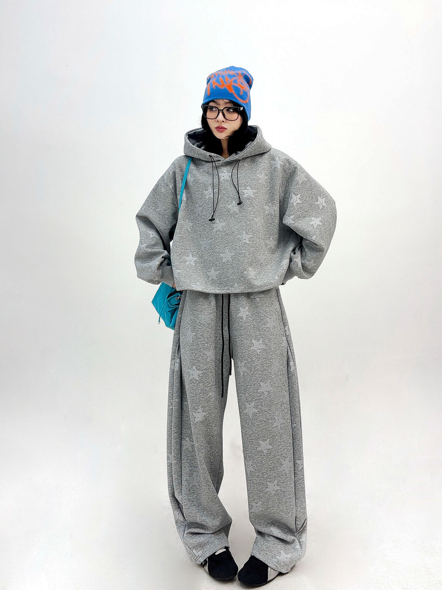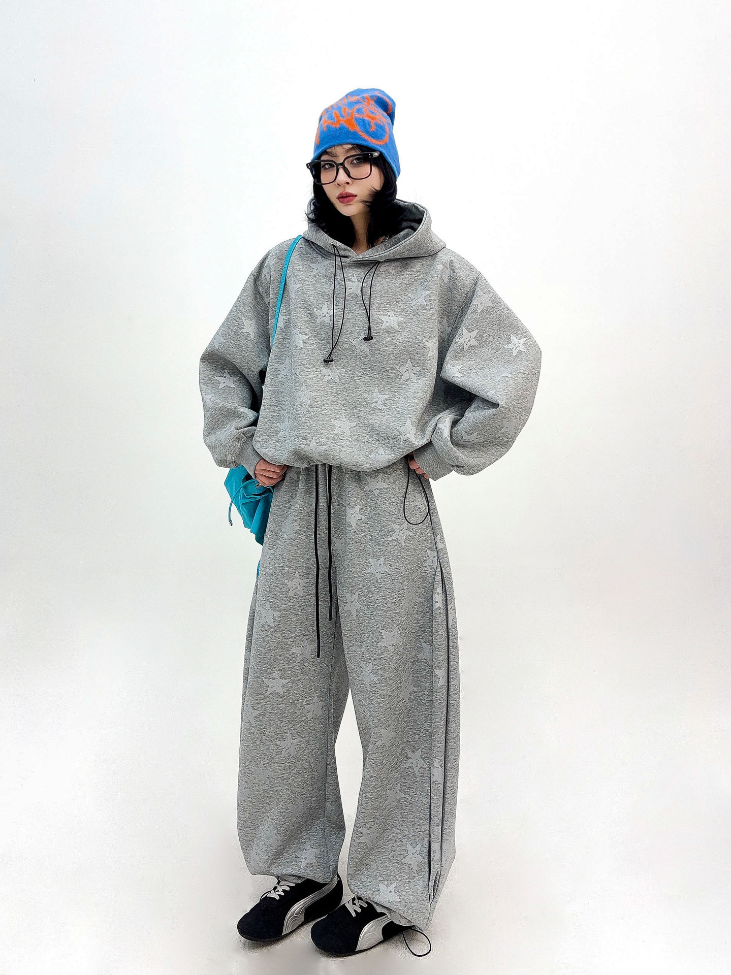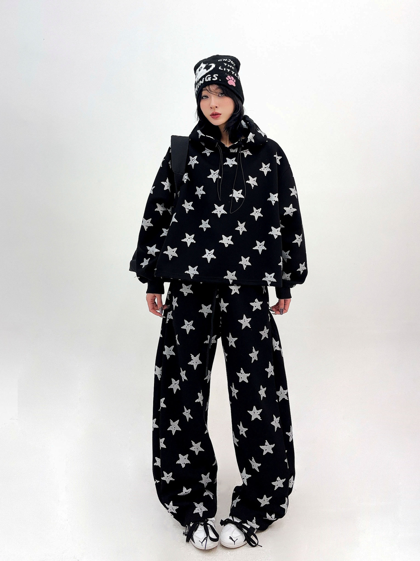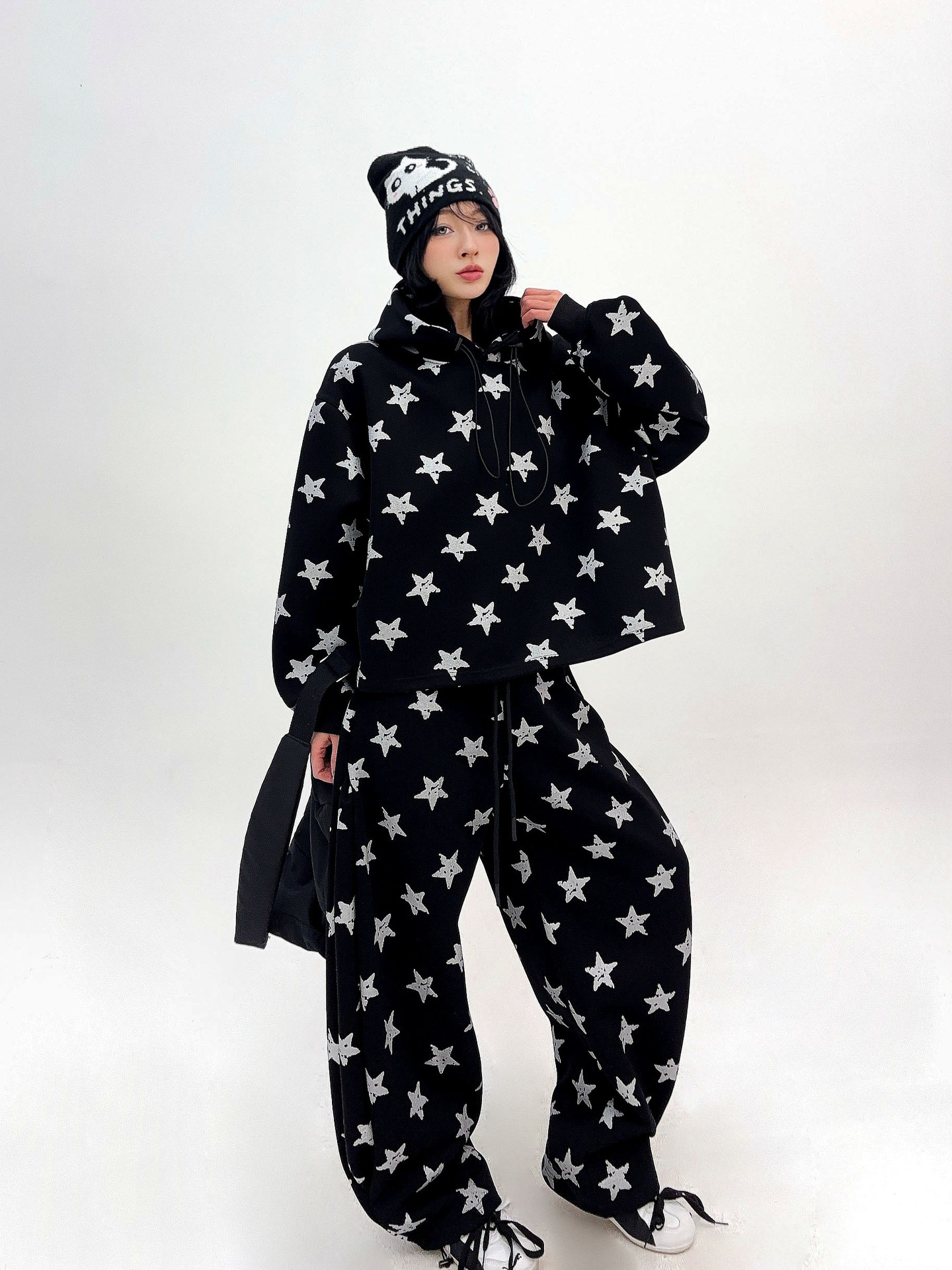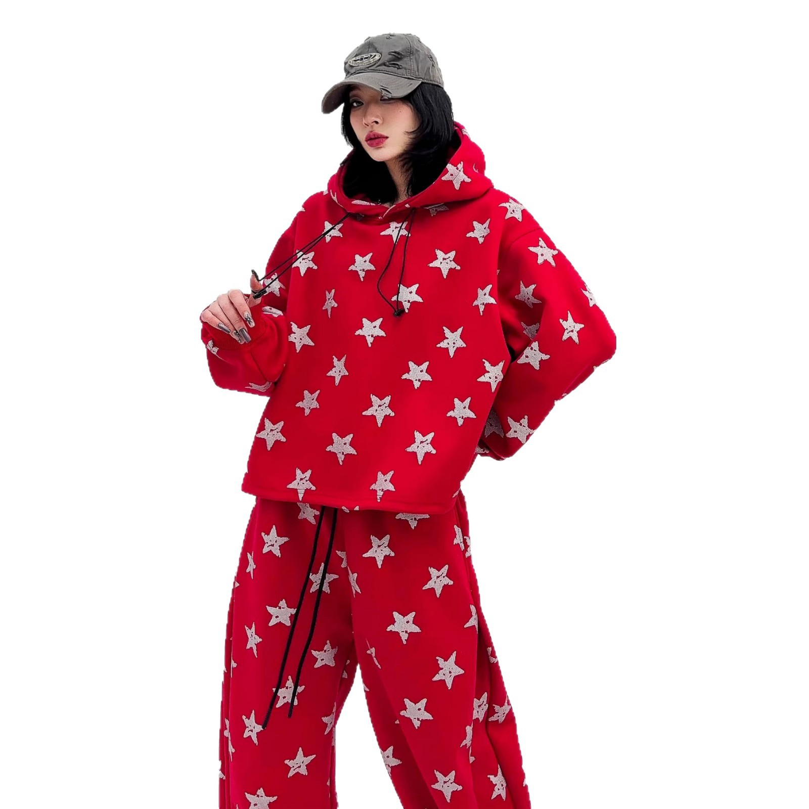 美式时尚套装别致星星满印连帽卫衣弯刀抽绳卫裤女春秋宽松两件套