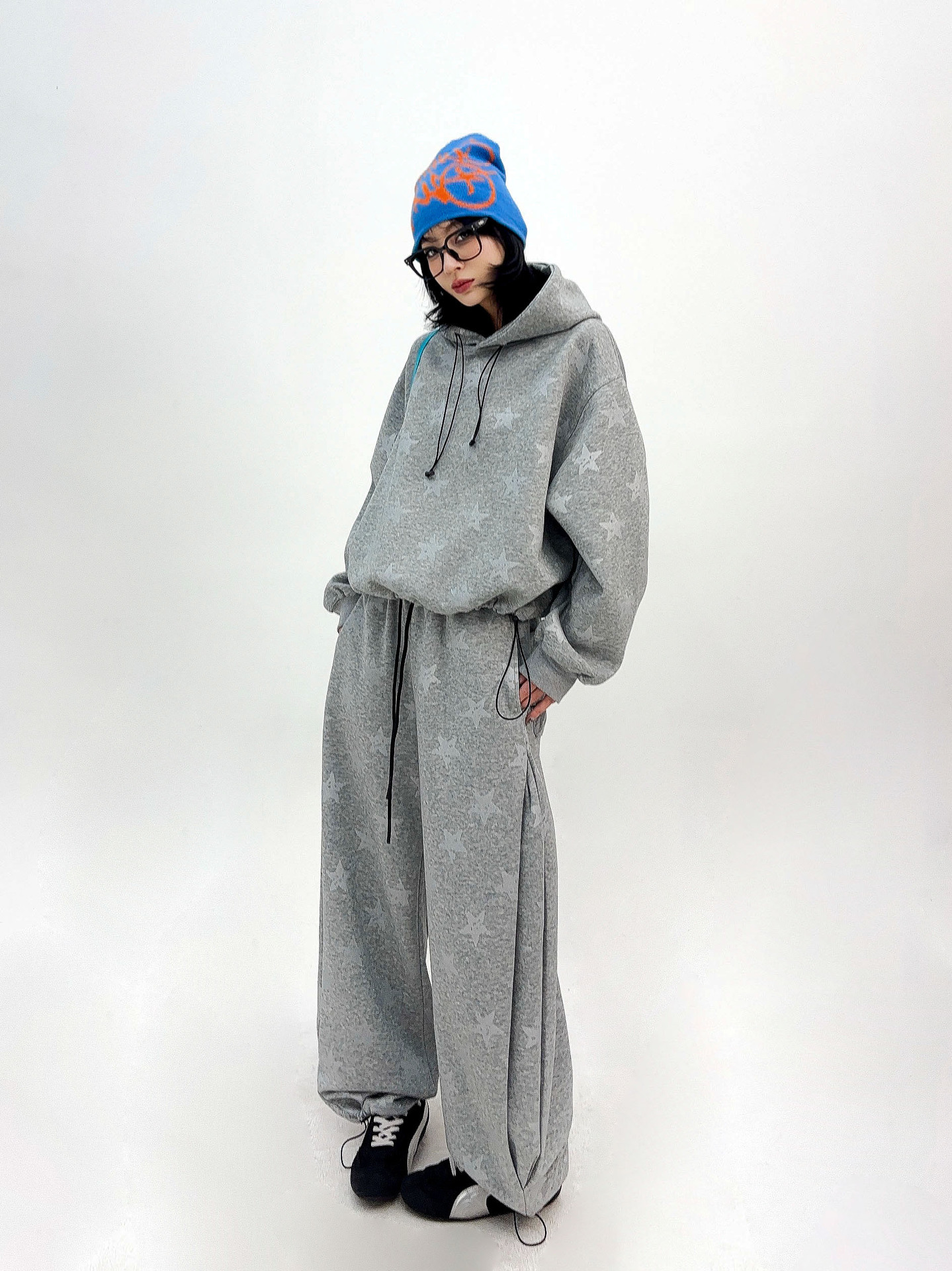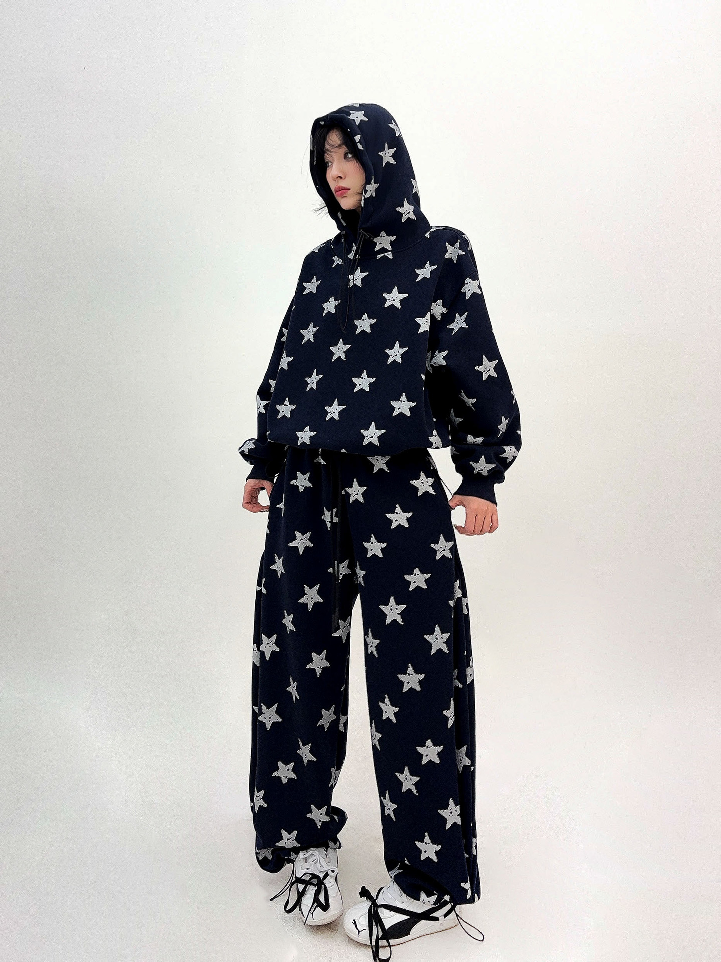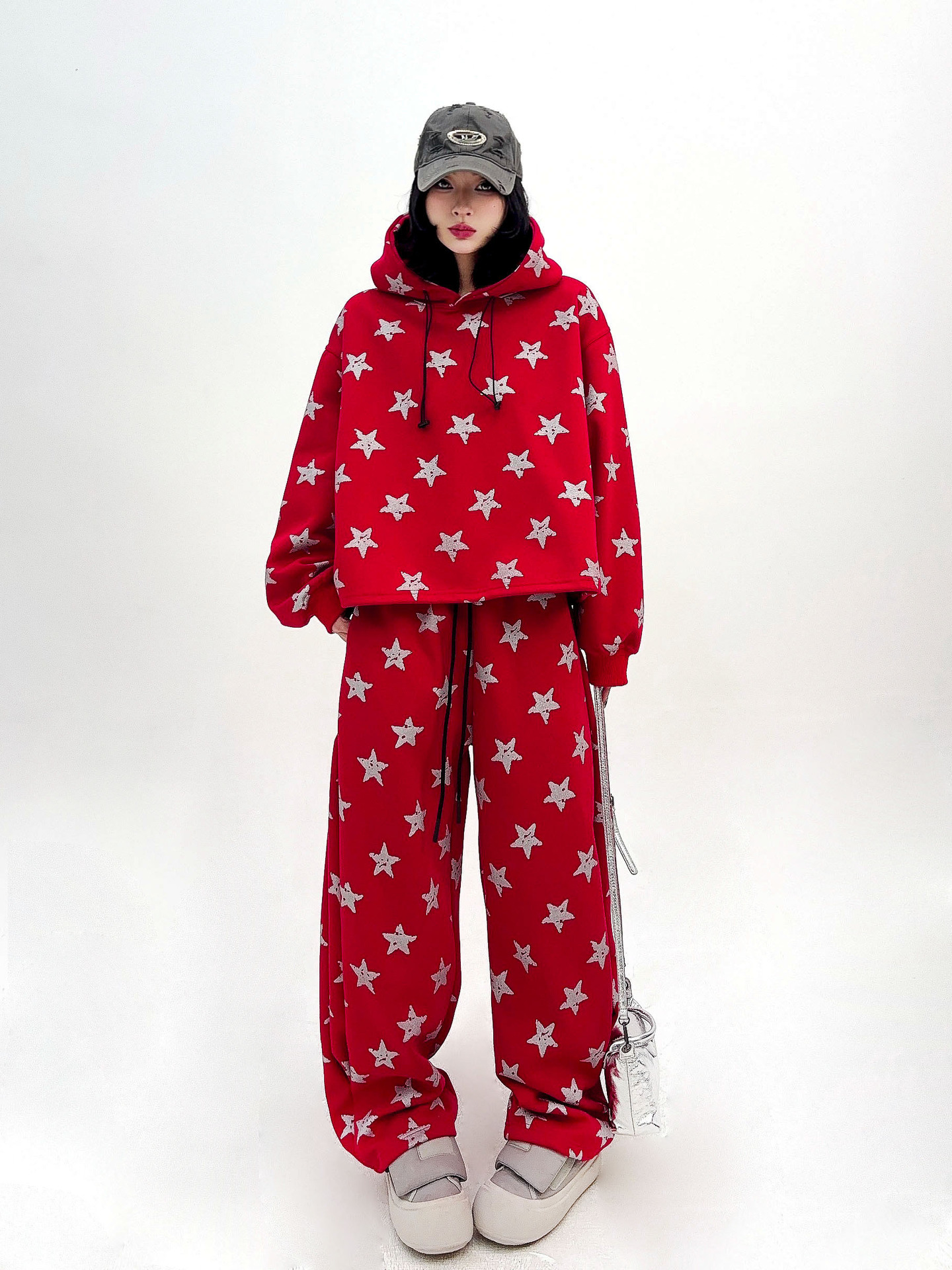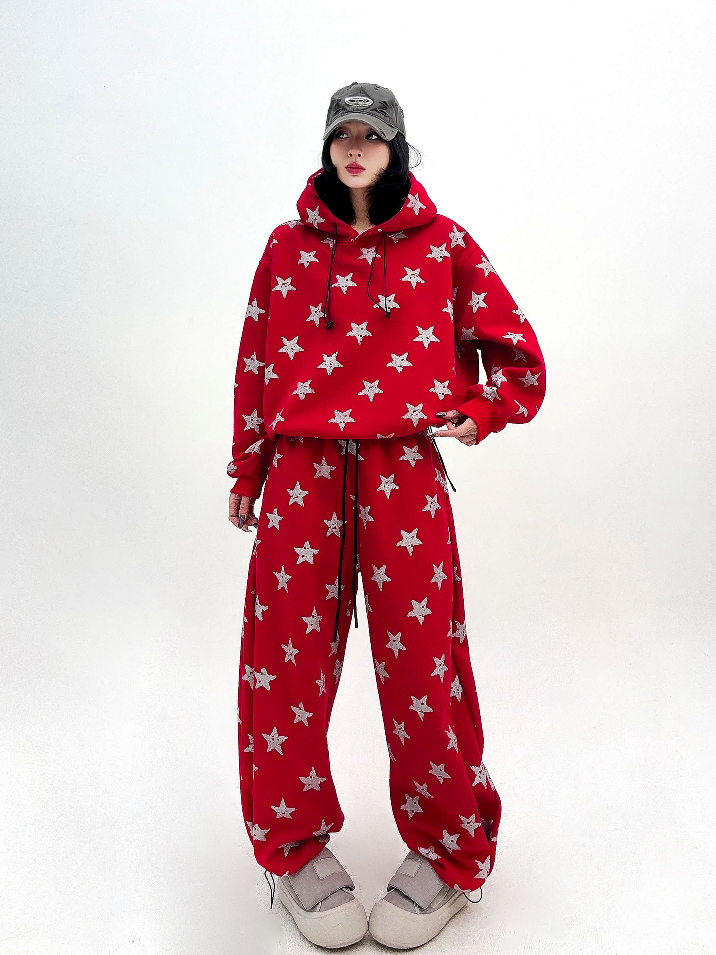 美式时尚套装别致星星满印连帽卫衣弯刀抽绳卫裤女春秋宽松两件套