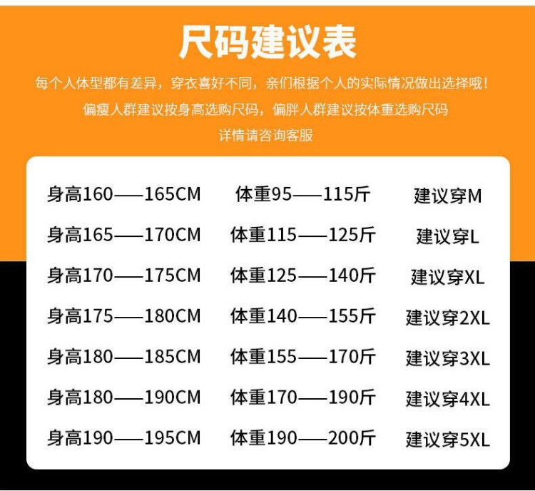 2XL 140--155斤; 3XL 155--170斤; M 95--115斤; L 115--125斤; XL 125--140斤