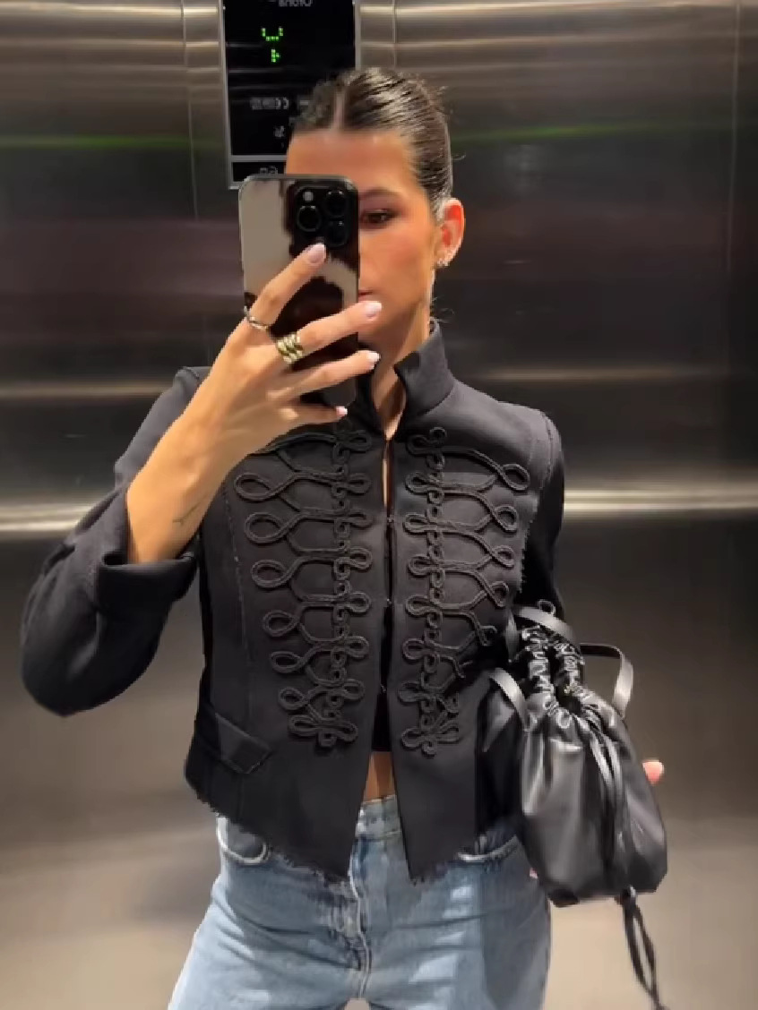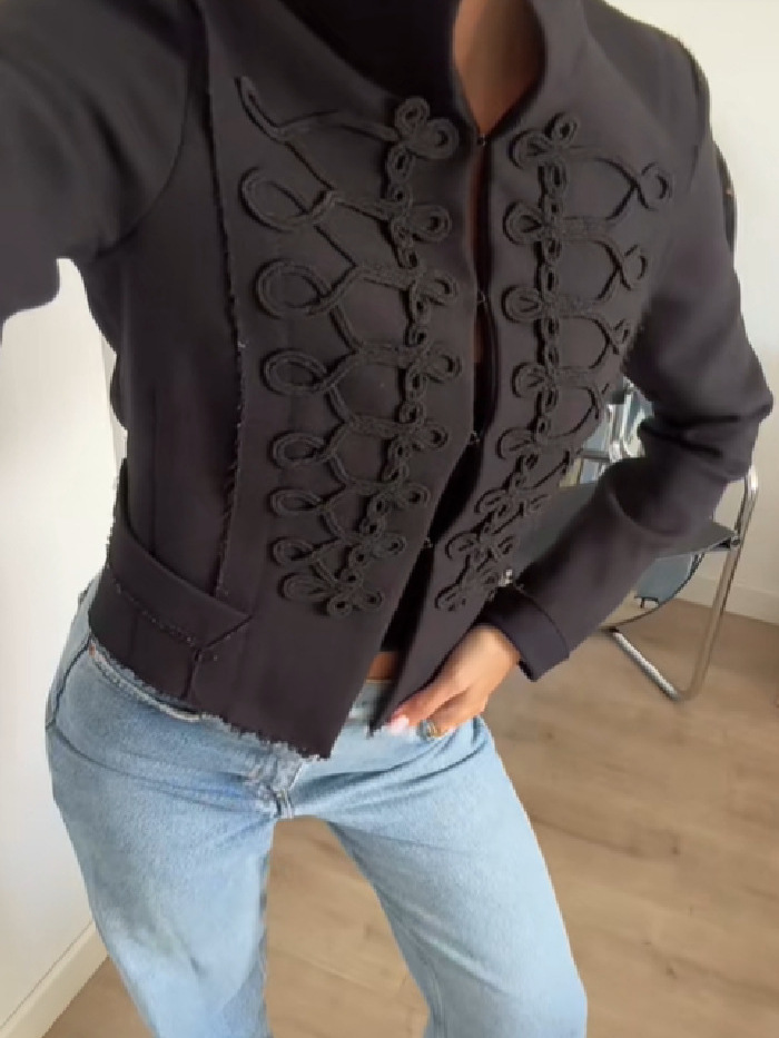 黑色(样衣实拍,实际大货有调整); 短款小立领纽扣外套-黑色