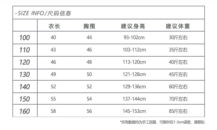 100cm; 110cm; 120cm; 130cm; 140cm; 150cm; 160cm