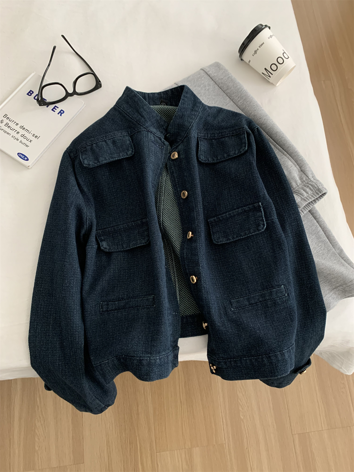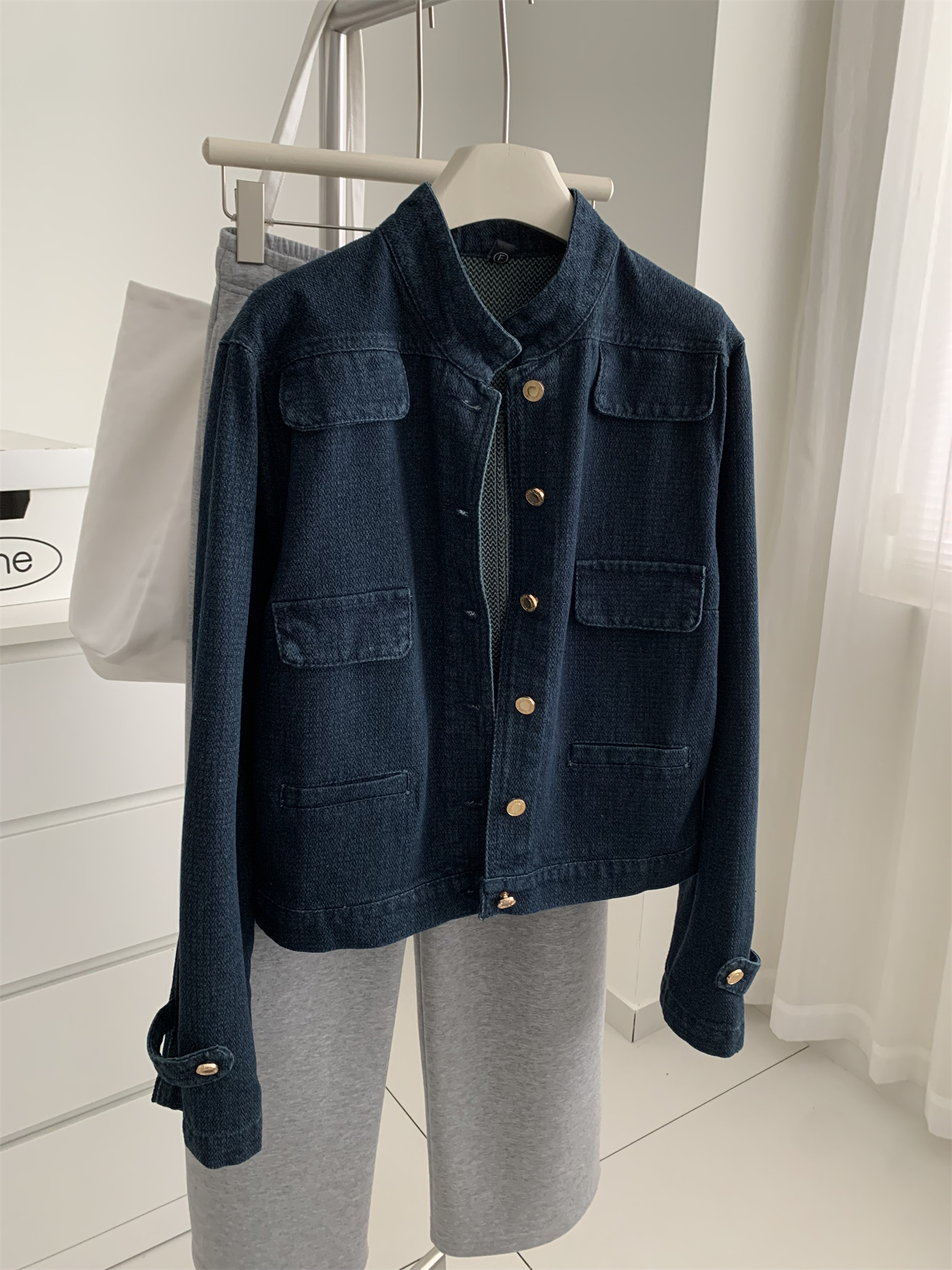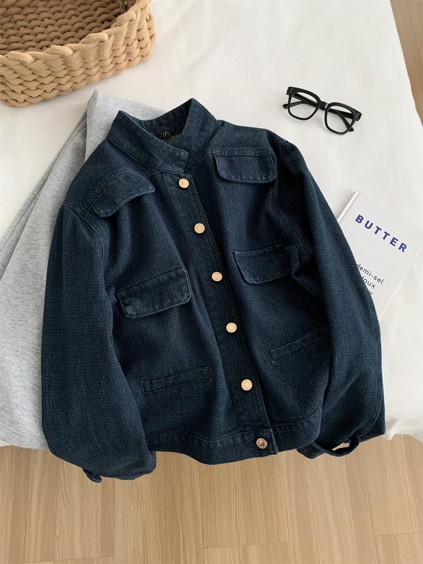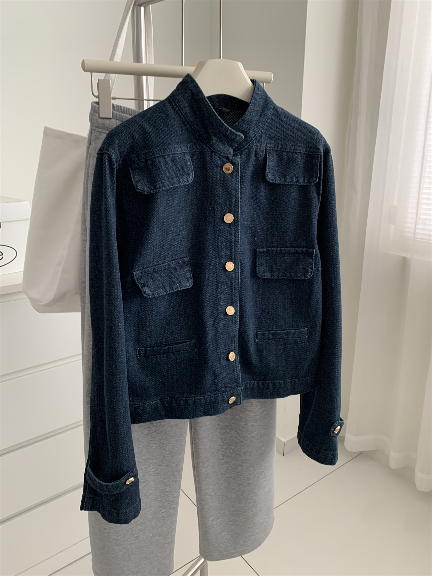 洋气复古小香风牛仔外套女水洗钴蓝色金扣立领小个子短款开衫春季